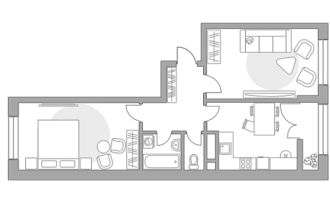 Жилая площадь 33.9 м2, кухня 12.56 м2. Площадь комнат: 17.10/16.80 м2, чистовая отделка, лоджий - 1.