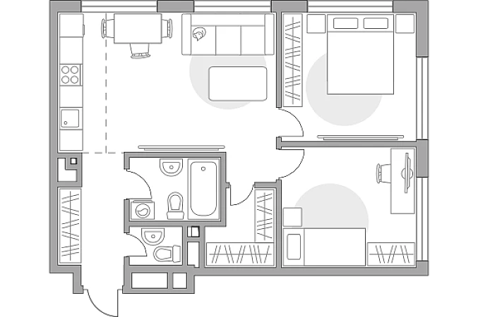 Жилая площадь 45 м2, кухня 5.04 м2. Площадь комнат: 19.34/13.32/12.34 м2, квартира без отделки, окна выходят на улицу.