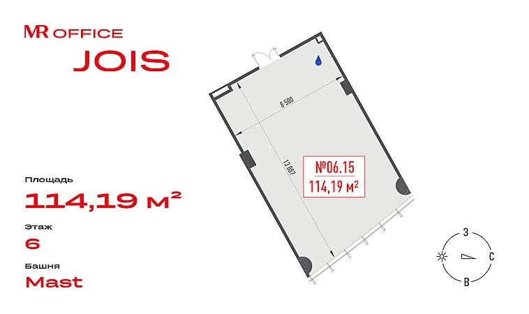 Предлагается офисное помещение 114.19 кв.м на 6 этаже БЦ Jois.