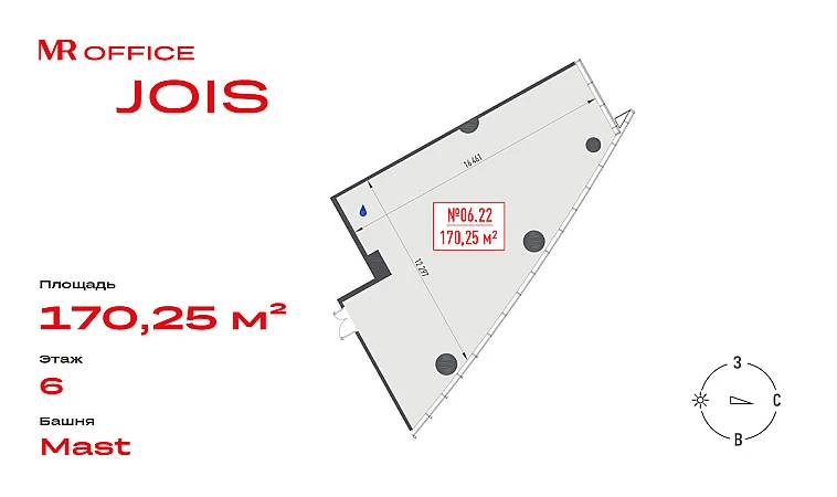 Предлагается офисное помещение 170.25 кв.м на 6 этаже БЦ Jois.