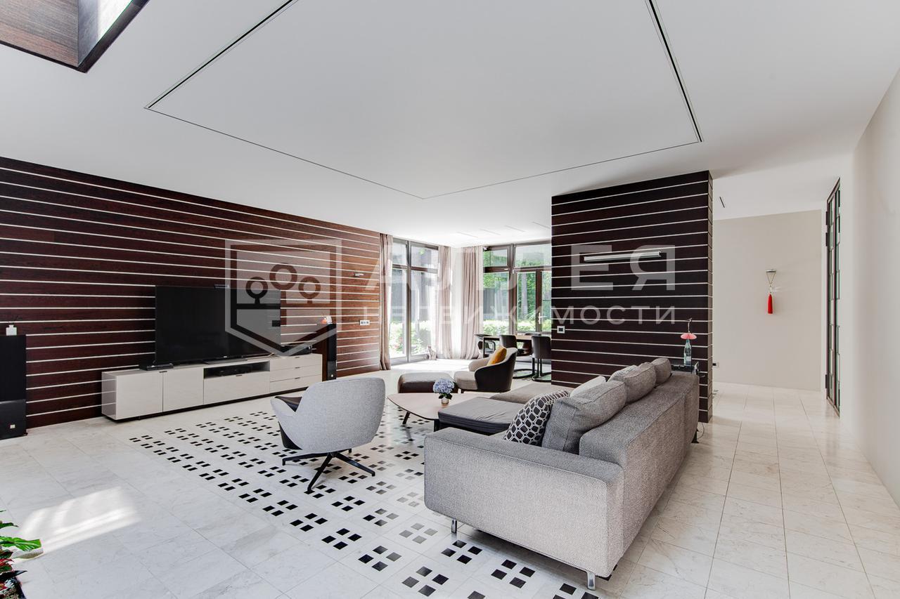 Загородный дом под ключ площадью 850 м2. В отделке фасада дома использованы медная черепица с элементами лиственницы. В интерьере дома установлены мебель и техника от мировых брендовых производителей.