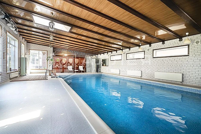 Трехэтажный дом полностью готов к проживанию. Планировкой дома предусмотрено 7 спален. В цоколе дома обустроен кинозал с баром. На первом этаже расположена спа-зона с бассейном 12х6, джакузи и сауна с дровяной печью, а также на этаже кухня с выходом на террасу, каминный зал и две спальни. На втором и третьем этажах спальные зоны и рабочий кабинет.