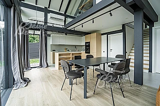 прихожая со встроенным шкафом, кухня-гостиная с выходом на приватную часть участка, гостевой с/у, блок сауны и душевой.