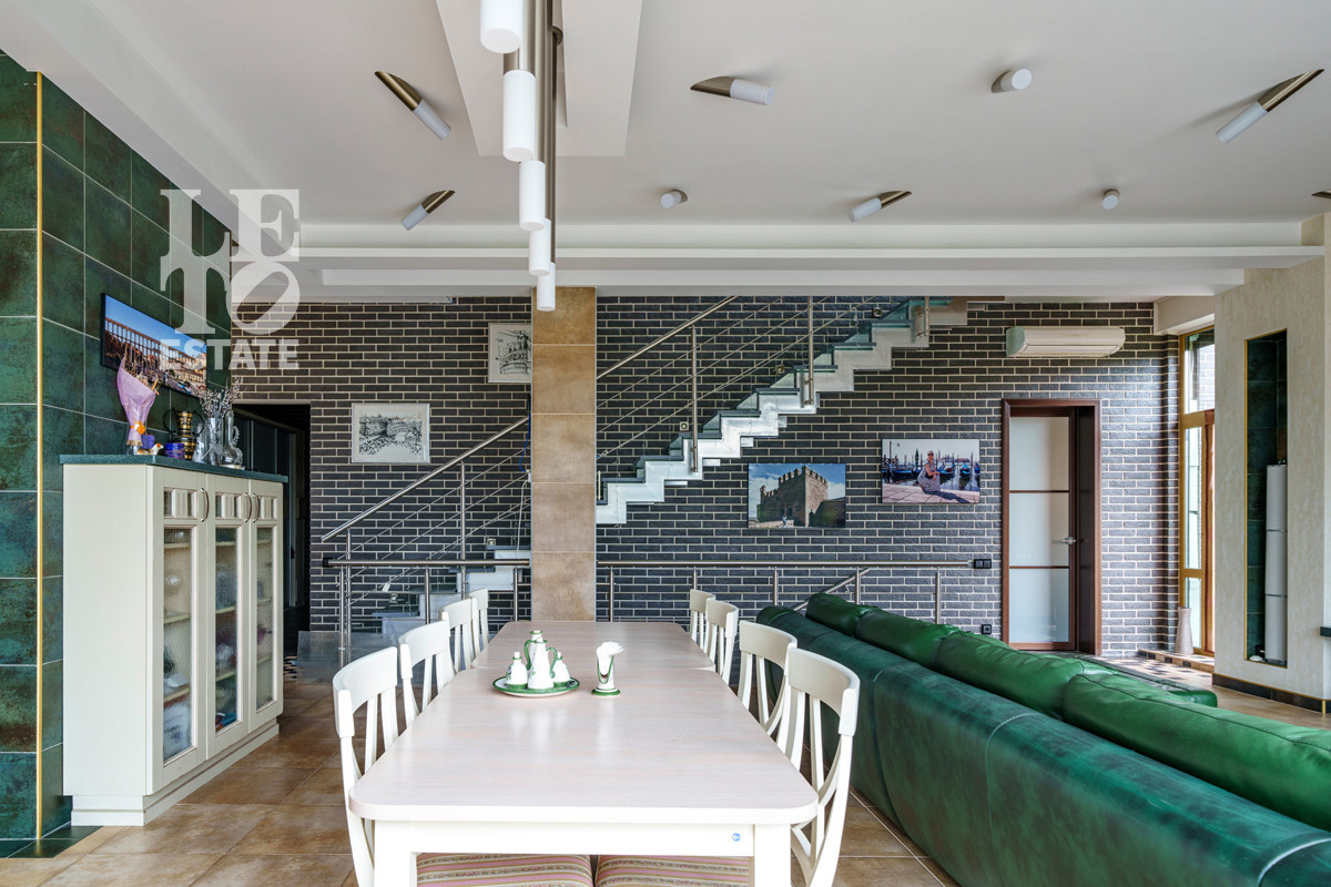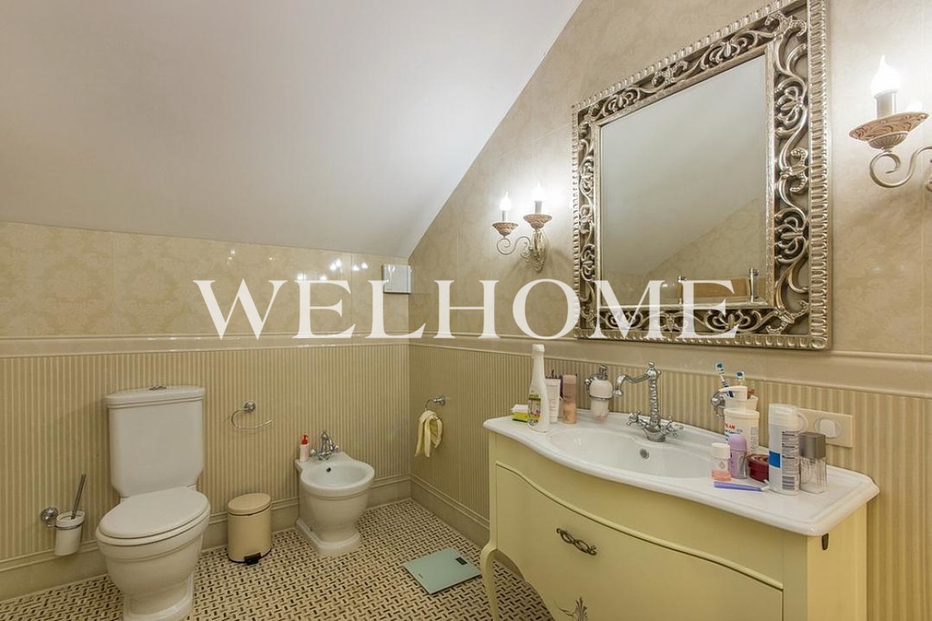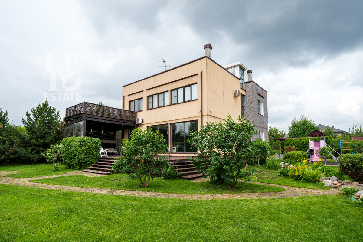 ID объекта: Z-3209. Предлагается дом в стиле шале на ландшафтном участке в охраняемом поселке. Деревянный коттедж с панорамным остеклением и большой террасой. Внутри спланированы квартира для персонала, тренажерный зал, 3 спальни, 4 с/у.Поэтажное описание: Цокольный этаж: котельная, постирочная, с/у, душевая, сауна, комната отдыха, тренажерный зал-игровая;1 этаж: кухня, столовая, гостиная, гостевая комната-спальня, комната для прислуги, с/у, терраса 45 кв. м.;2 этаж: основная спальня с собственной ванной и гардеробной комнатами, кабинет-спальня, детская, санузел, терраса 40 кв. м.;Мансарда - 20 кв. м.На ландшафтном участке возведен гараж на 2 м/м, беседка-барбекю, созданы альпийская горка, декоративный пруд, детская площадка. Все коммуникации центральные.Участник ассоциации AREA!