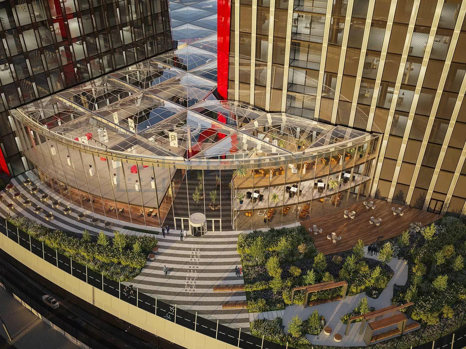 Эксклюзивные дизайнерские элементы: собственное лобби от студии Yorgo Lykouria, свыше 5,5 тысяч световых панелей, итальянская мраморная облицовка арабескато и стеклянный атриум высотой восемь этажей.