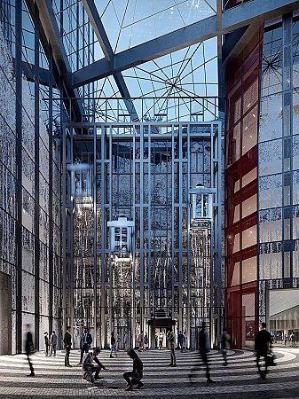 Эксклюзивные дизайнерские элементы: собственное лобби от студии Yorgo Lykouria, свыше 5,5 тысяч световых панелей, итальянская мраморная облицовка арабескато и стеклянный атриум высотой восемь этажей.