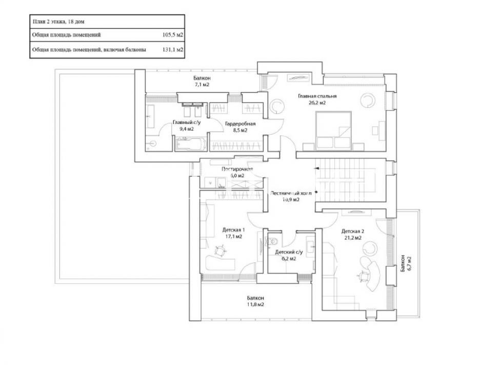 2 этаж: холл, спальня с гардеробной и с/у, 2 спальни, с/у, постирочная.