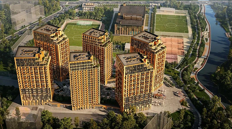 Элитный жилой комплекс представляет собой 6 корпусов с уникальными фасадами благородного золотого цвета, сочетание: металла, дерева и стекла. Волнообразные стеклянные ограждения французских балконов отсылают к реке Яуза, на набережной которой находится ЖК. Срок сдачи 2 кв. 2025 – 1 кв. 2026г.