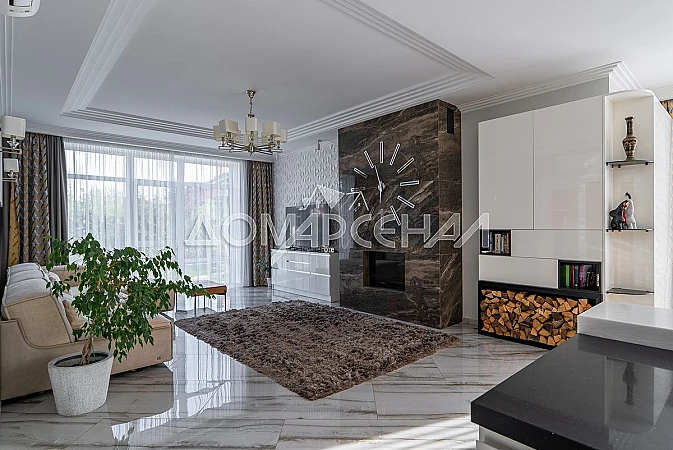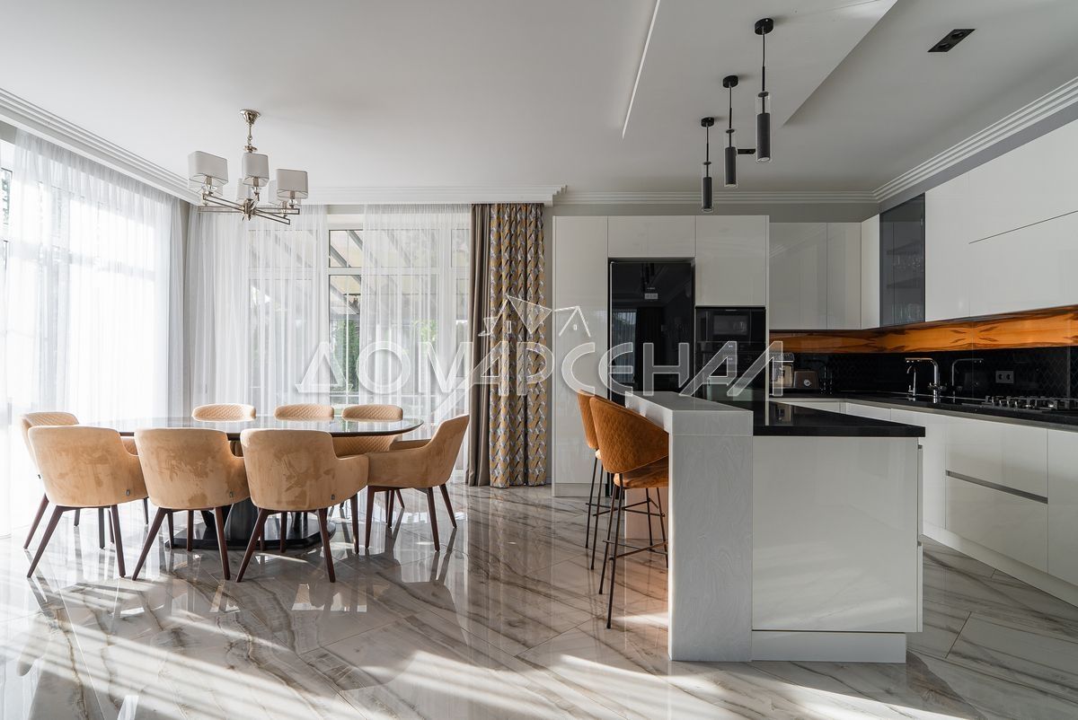 • Просторная кухня-гостиная с высокими потолками и многоуровневыми подвесными потолками с треккинговой системой освещения создают атмосферу уюта и стиля