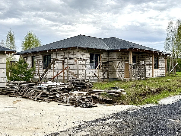 Гостевой дом 70 кв.м. стоит на монолитной плите, стены газоблок, крыша - мягкая кровля, будут установлены пластиковые окна.