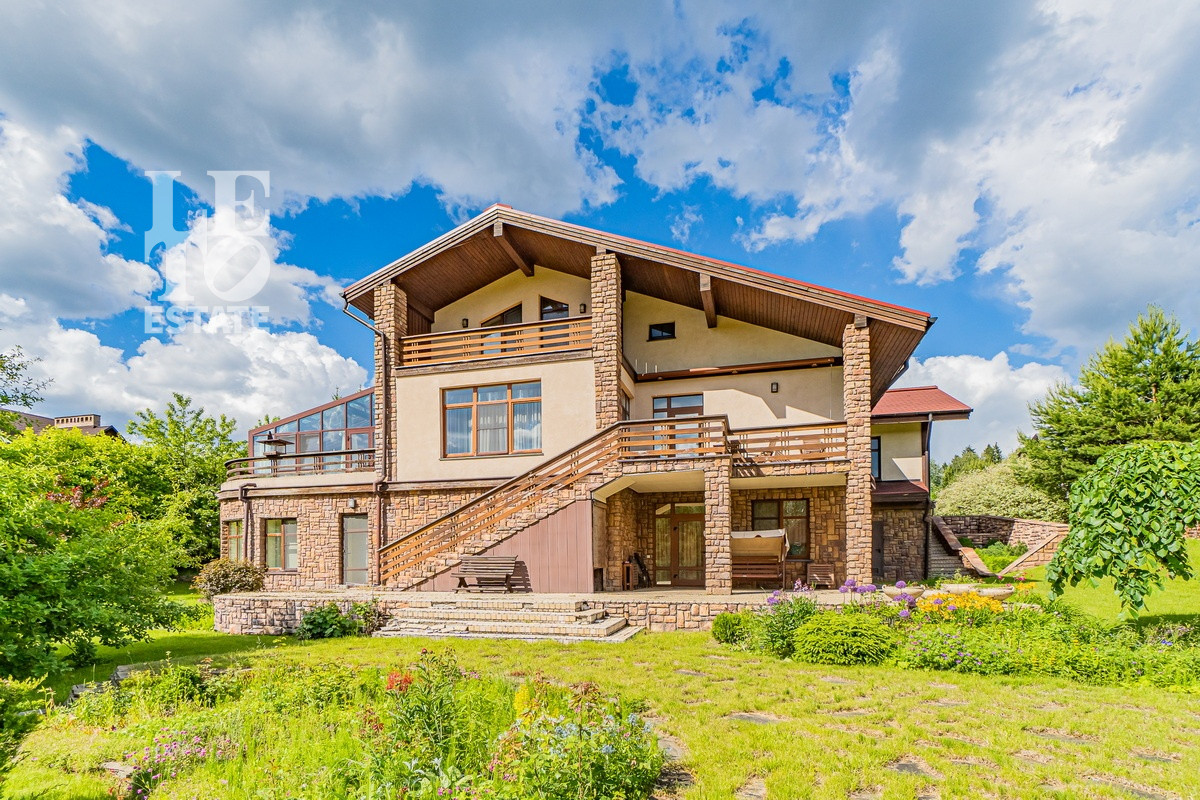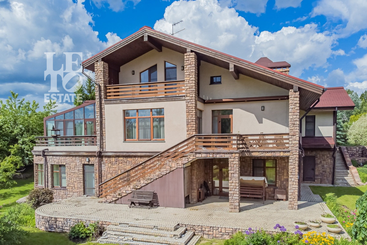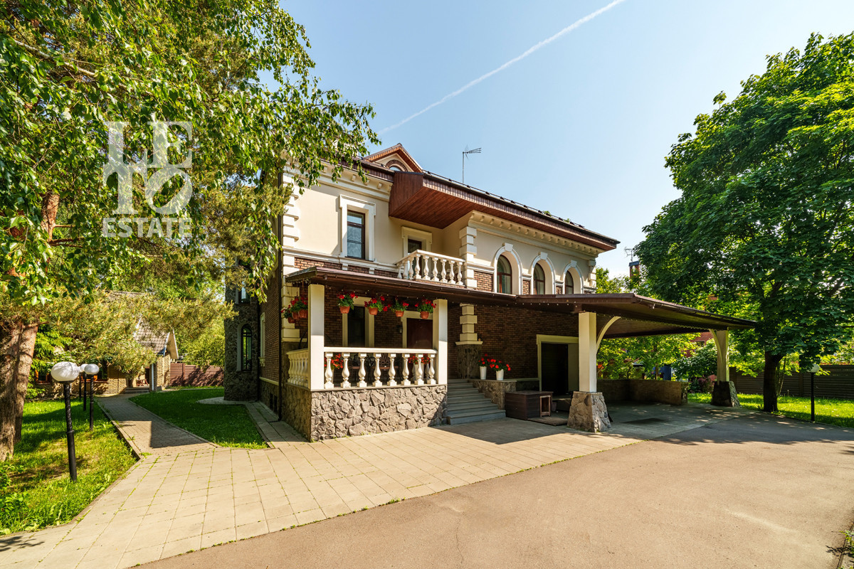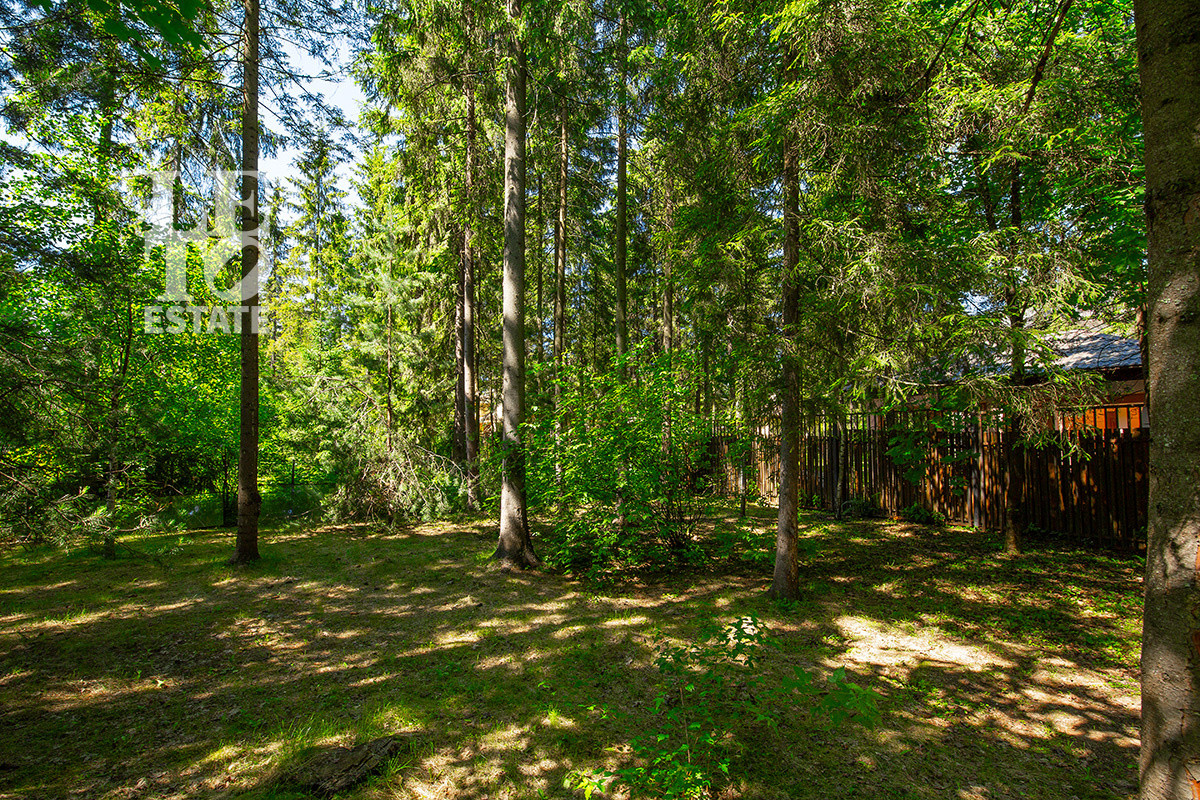 Дом расположен в тихой лесной части поселка. На участке имеются как большие лесные деревья, так и высаженные декоративные растения и кустарники. Помимо основного дома на участке построен дом для персонала и дом охраны.
