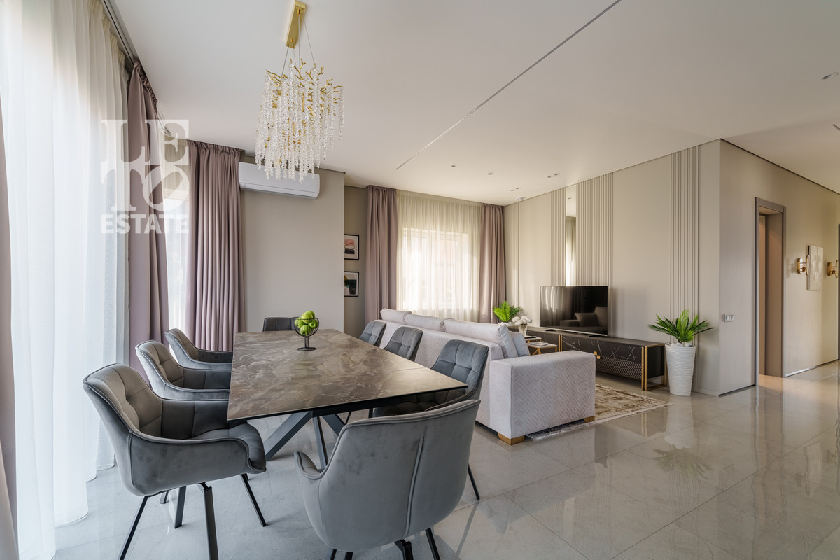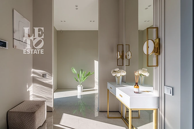 В доме есть вся необходимая мебель и встроенная техника для постоянного проживания. Есть теплые полы, сделано зонирование освещения, установлено кондиционирование.