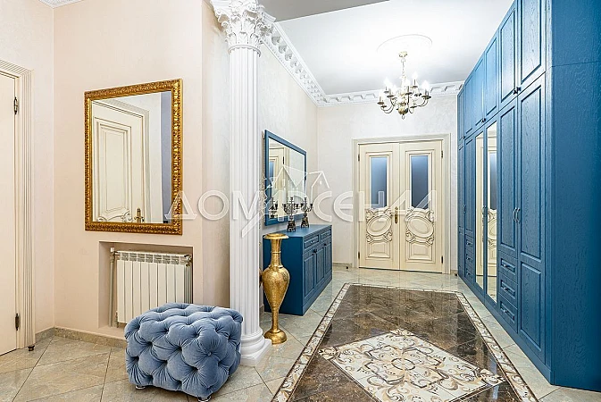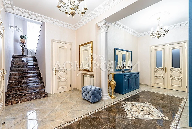 1 этаж: Кухня-столовая, гостиная c мраморным камином украшена натуральной лепниной ручной работы, гостевой санузел, котельная с постирочной, кладовая, гараж на 1 м/м