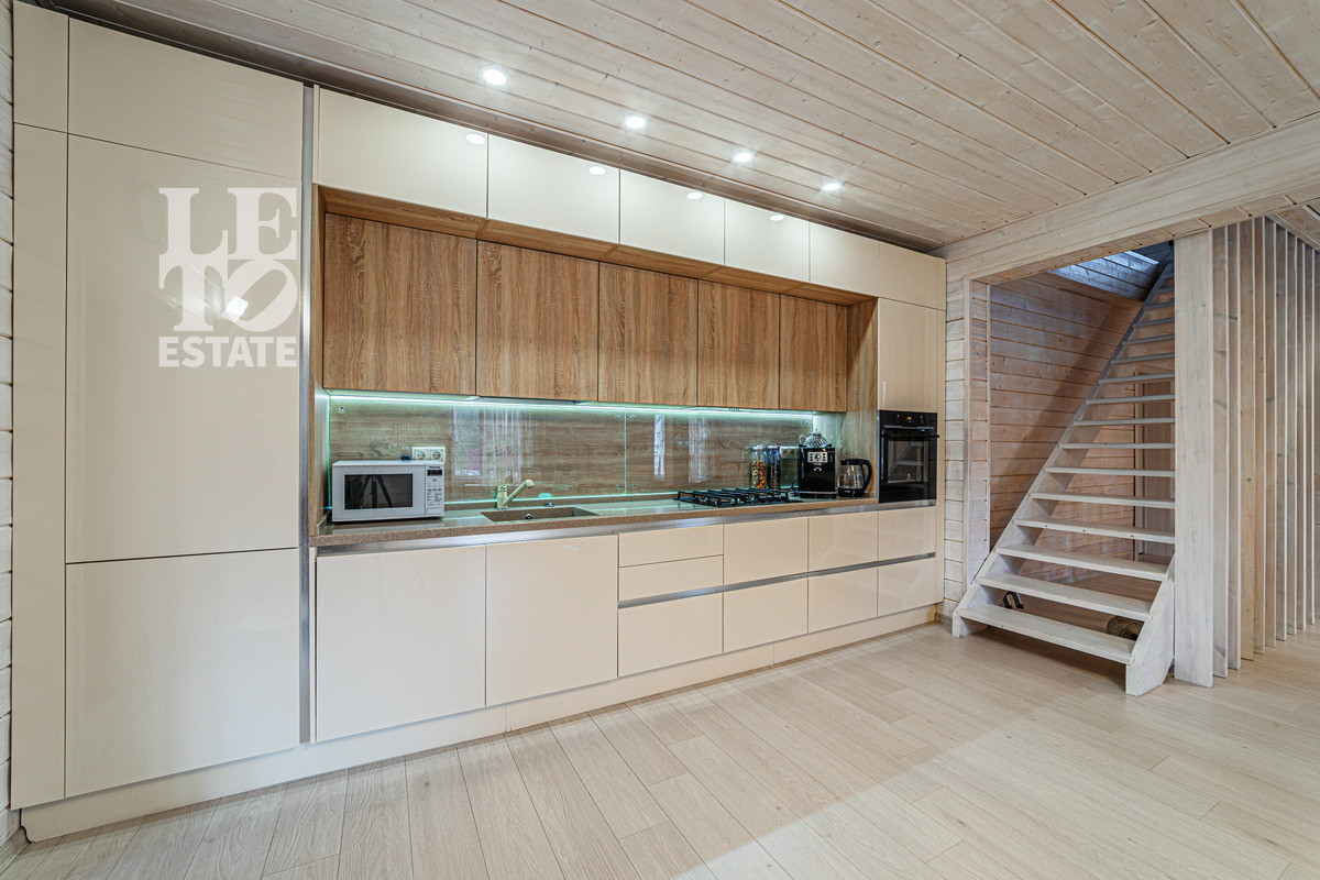Внутри выполнена качественная отделка по индивидуальному проекту. Дом продается со всей необходимой мебелью и техникой. Встроенный кухонный гарнитур с бытовой техникой. В гостиной есть дровяной камин.