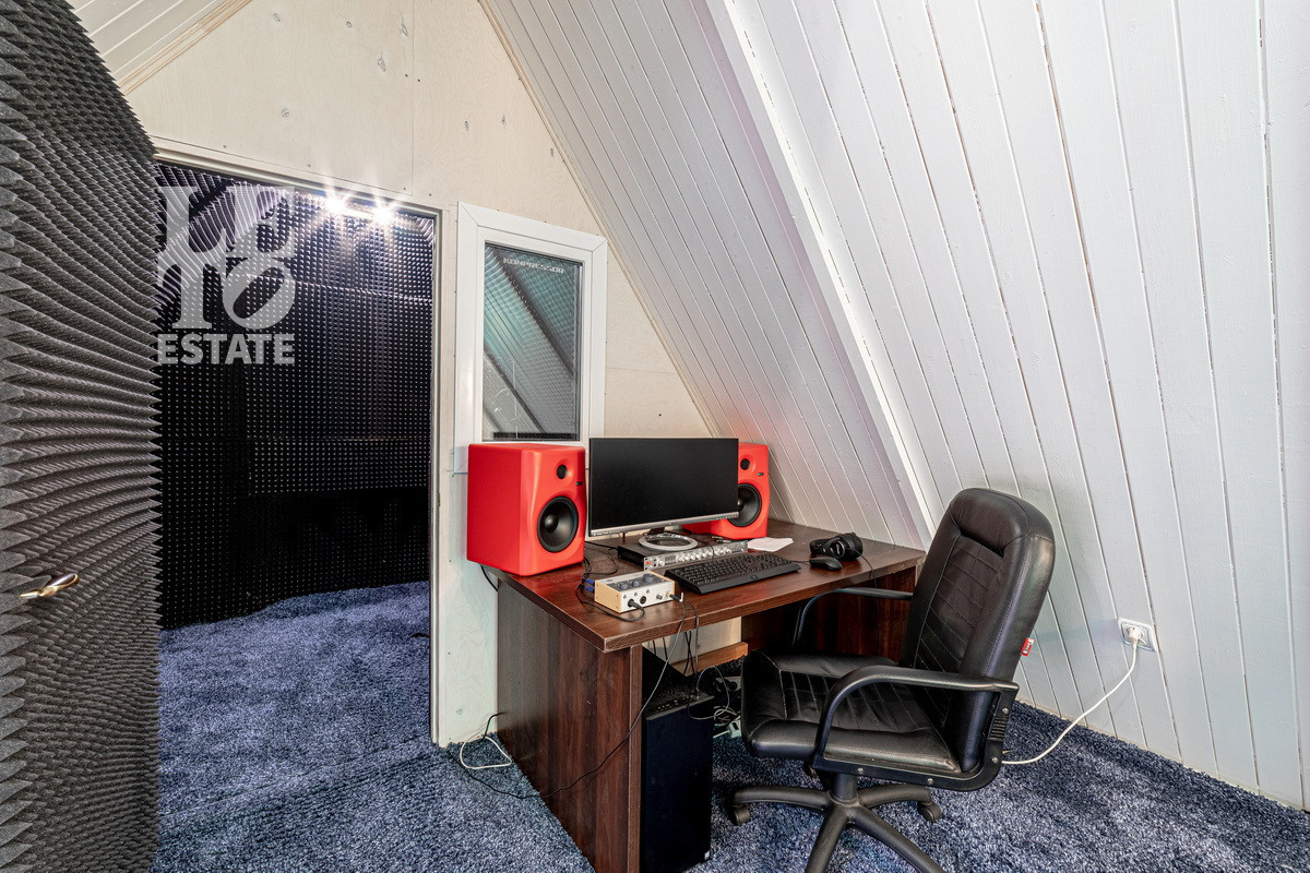 На просторном участке 12 соток выполнен ландшафтный дизайн, сделан дренаж, высажен газон, организован небольшой пруд. Есть просторная мангальная зона, отдельно стоящая баня, теплый гараж на два автомобиля и дополнительно парковка перед домом.