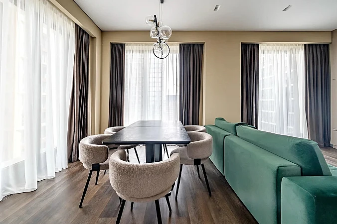 Площадь квартиры — 89 м2, потолки 3, 2 м. Идеальная высота — 14 этаж из 41: отличный обзор города, отсутствие шума улицы и живописные виды.