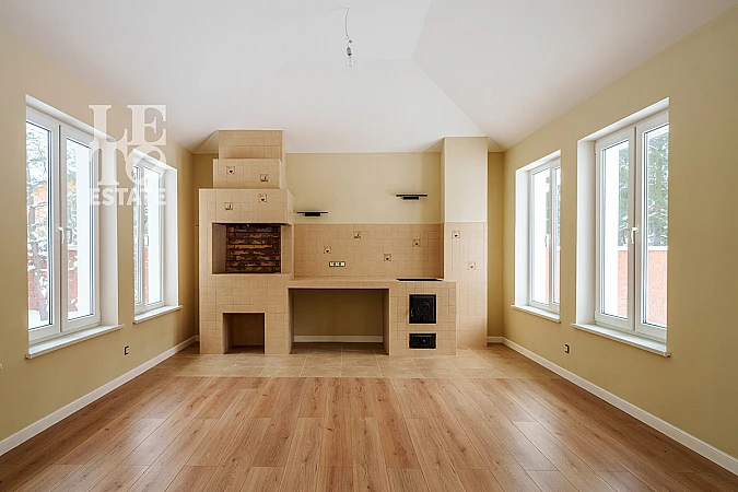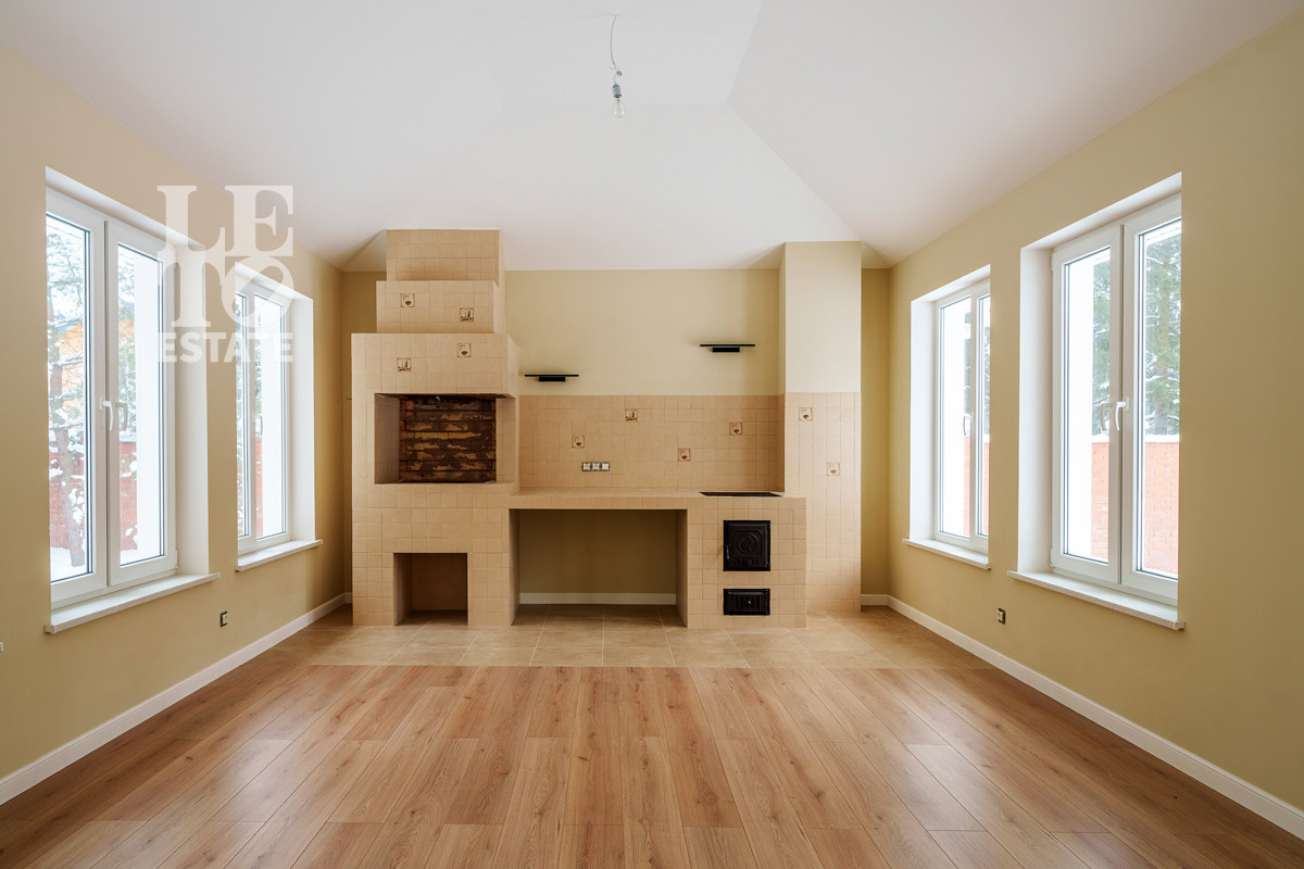На первом этаже вы найдете кухню с выходом на крытую зону барбекю и просторную столовую. Встраиваемая техника фирмы BOSCH. Вытяжка NEFF. В гостиной имеется камин ручной работы, выполненный на заказ из керамики. А также удобная комната с двумя выходами в прихожую или в зону кухни-столовой.