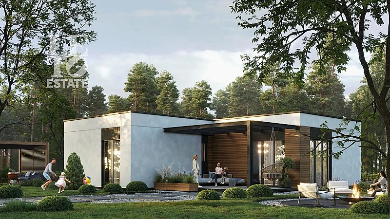 Дом в стиле "Сканди", представляет собой сочетание минимализма, функциональности и природных элементов. Современная внешняя отделка и плоская кровля придает зданию стильный вид. Стены, выполненные из утепленных железобетонных плит, обеспечивают надежную защиту и сохраняют уютную атмосферу внутри помещения. Большие окна в пол в каждой комнате позволяют наслаждаться потрясающим видом на окружающую природу и наполняют пространство светом.