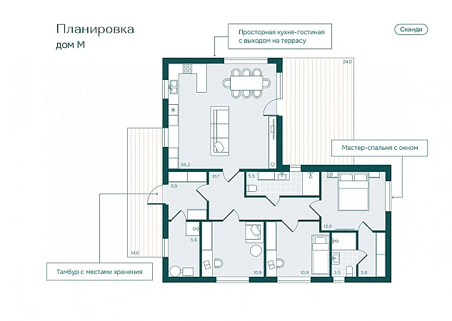 Прихожая, кухня-столовая-гостиная с выходом на террасу 24 м2, мастер-спальня со своим санузлом и гардеробной, гостевая спальня, спальня или кабинет, санузел, кладовая- котельная.