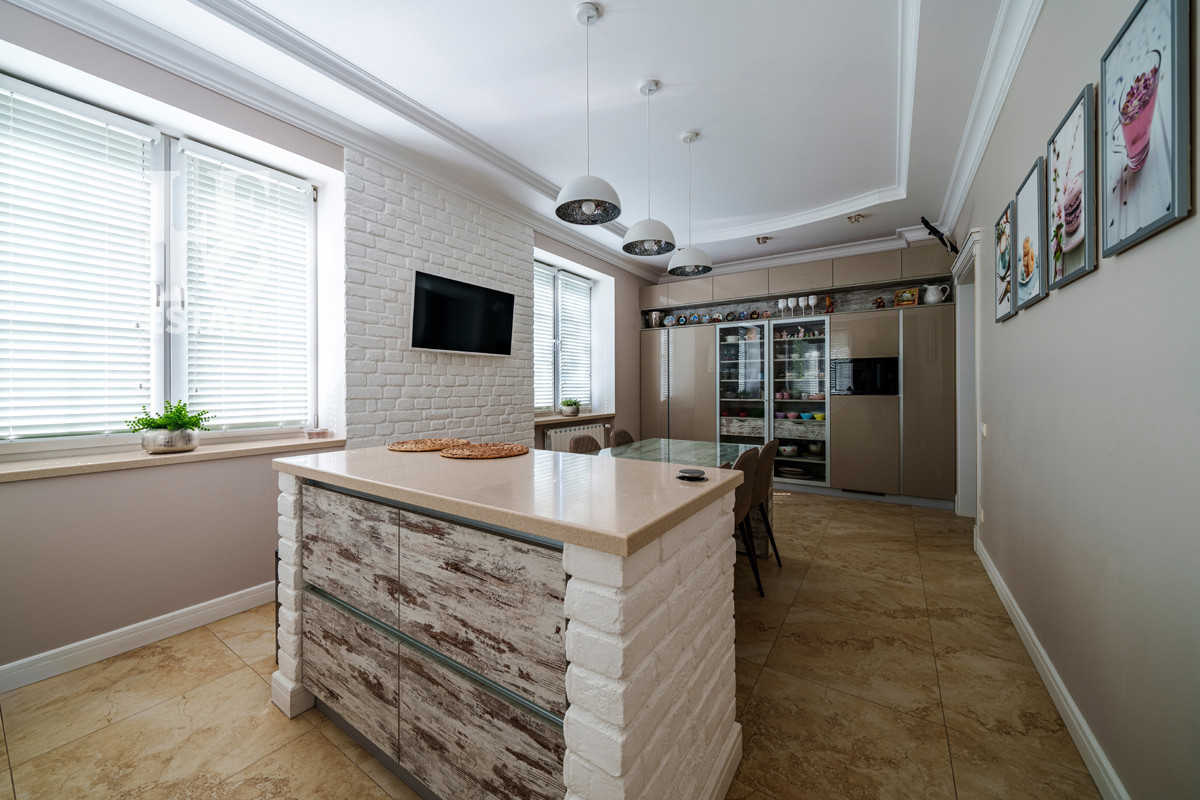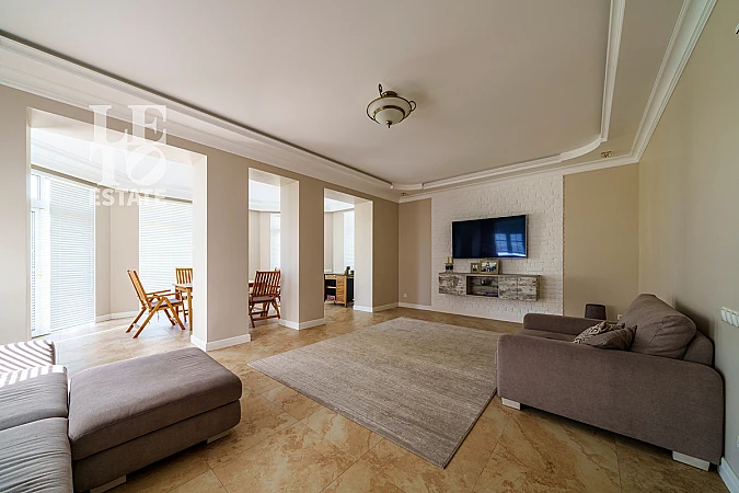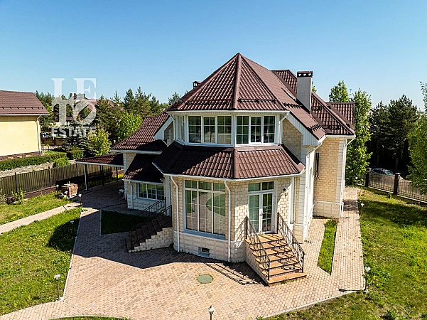 Внутренняя отделка выполнена с использованием только качественных и дорогостоящих материалов. Полы выложены декоративной плиткой и паркетной доской из массива дерева. Кухня выполнена на заказ и оснащена всей необходимой встроенной техникой ведущих мировых производителей (Zigmund & Shtain, NEFF, Liebherr). В дом заведены и разведены теплые полы от фирмы Rehau, оснащены системой «аквастоп». Сделаны выводы под систему кондиционирования. Под окнами установлены конвекторы. Лестница выполнена из натурального дерева (дуб).