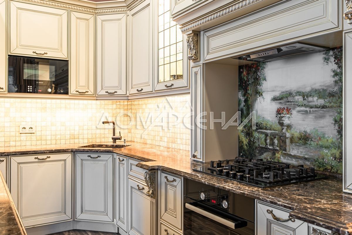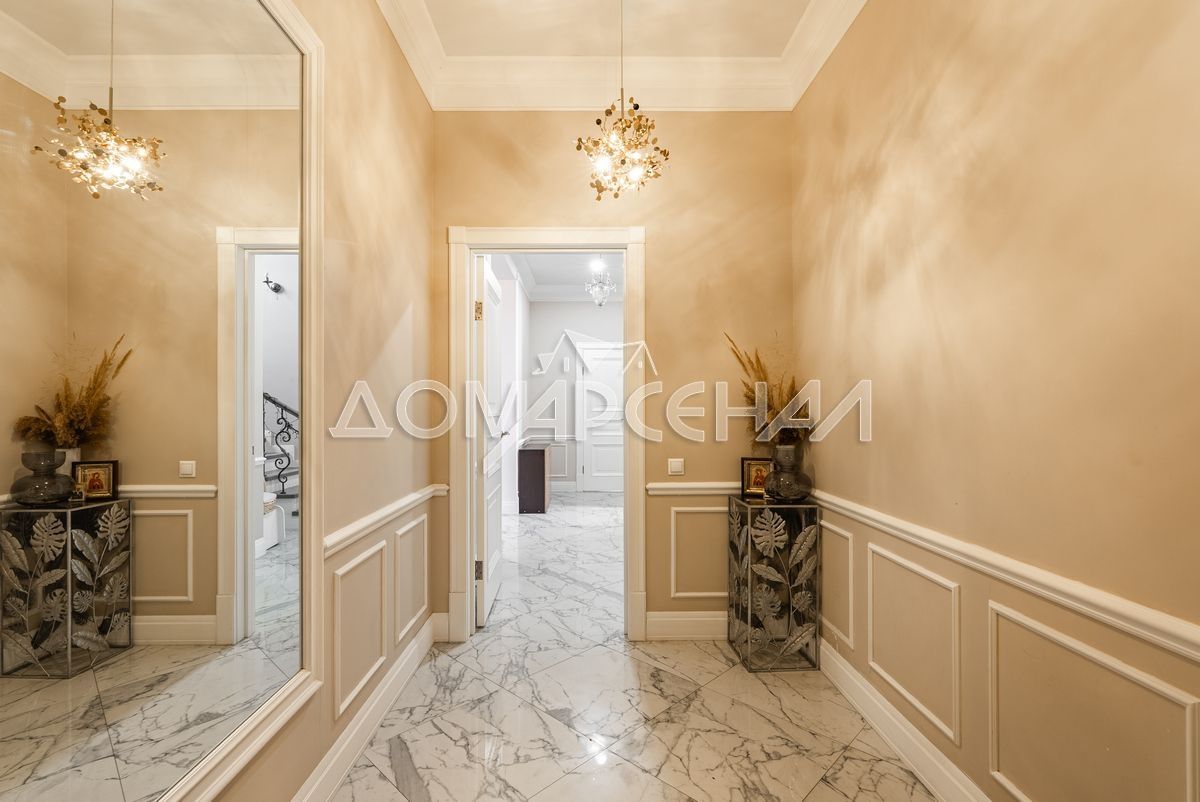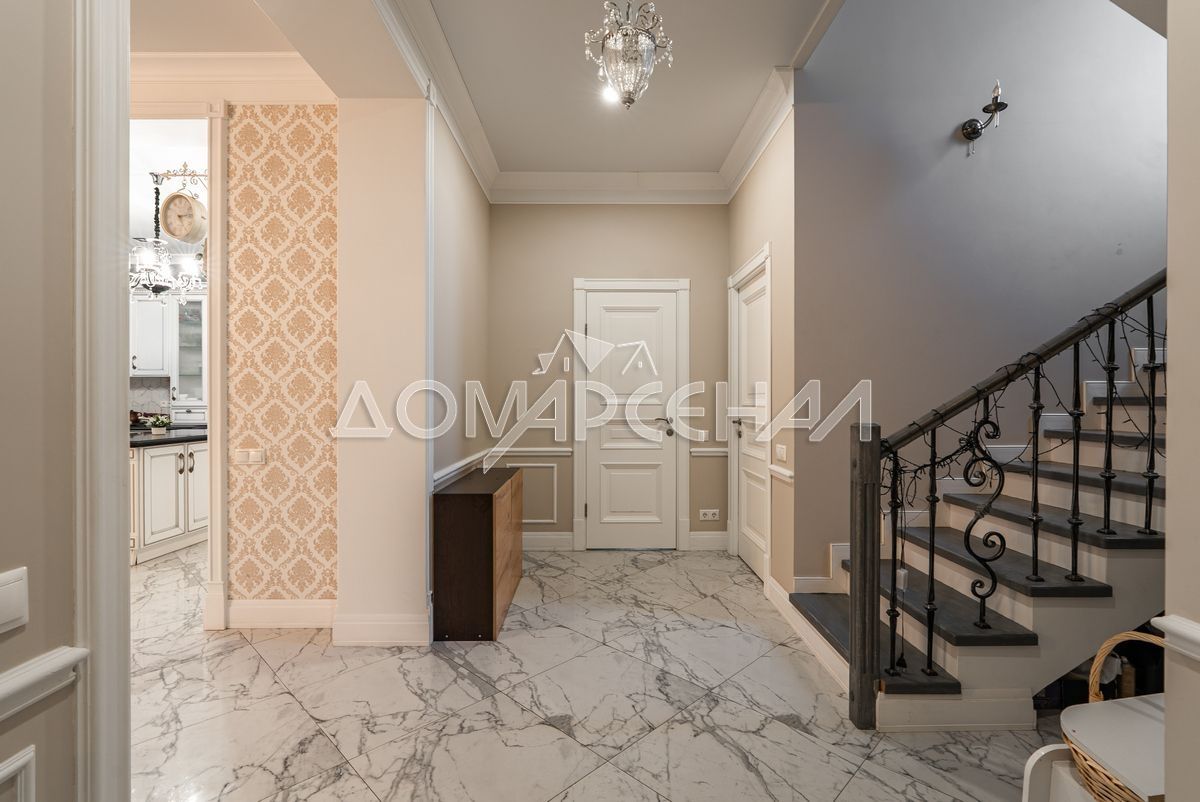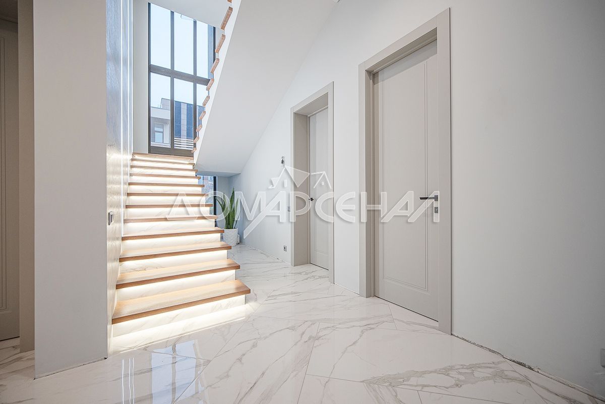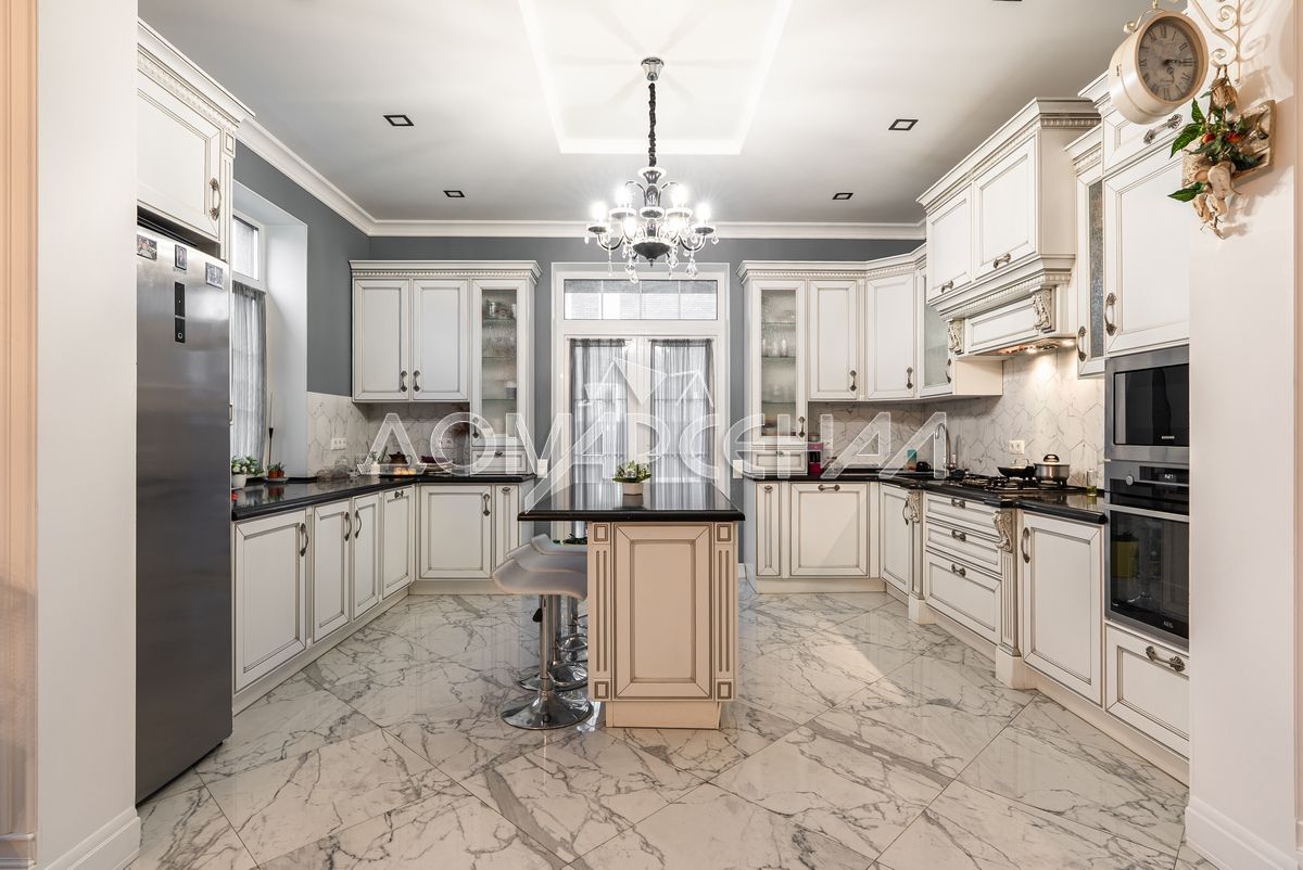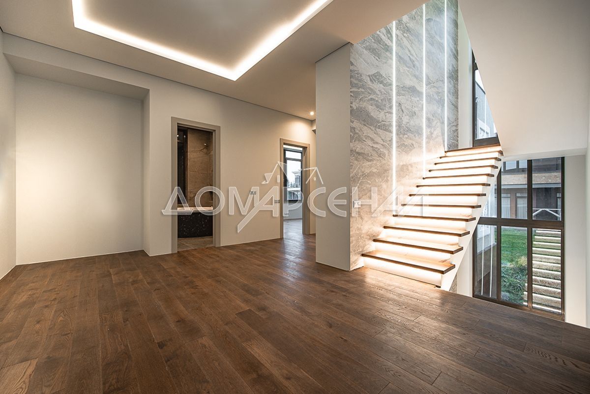 На стенах декоративная штукатурка, дизайнерские элементы из дерева, ниши со скрытой подсветкой, На полу керамогранит с водяным подогревом (все санузлы, прихожая, холл, зона кухни и зона гостиной); паркетная доска (дубовая) – все спальни и холл второго этажа. Лестница жб монолитная, ступени – массив дуба, поручни деревянные (дуб), балясины металлические с хромированными элементами. Потолки подвесные ГКЛ разноуровневые и натяжные (французские) с дизайнерскими элементами и различной подсветкой (скрытая светодиодная, точечные споты, движущиеся споты на рейлингах, люстры). Вся сантехника ведущих брендов. Душевые без поддонов (встроенная система слива в пол) и со стеклянными дверцами. Все разведено, конвекторы встроенные напольные, электрика АВВ (Германия). Двери деревянные шпонированные, высота 2.3 м, подоконники из массива ореха.