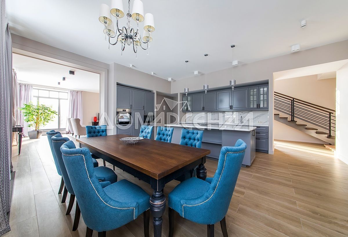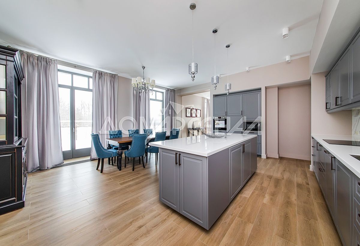 Просторный современный коттедж из кирпича с качественным ремонтом в клубного поселка премиум класса. Дом полностью меблирован и готов к проживанию. В доме 4 спальни, прихожая, лестничный холл, кухня (20.77 кв.м), роскошная гостиная-столовая со вторым светом с камином и панорамным остеклением, большая общая зона с балконом-галереей, библиотека.