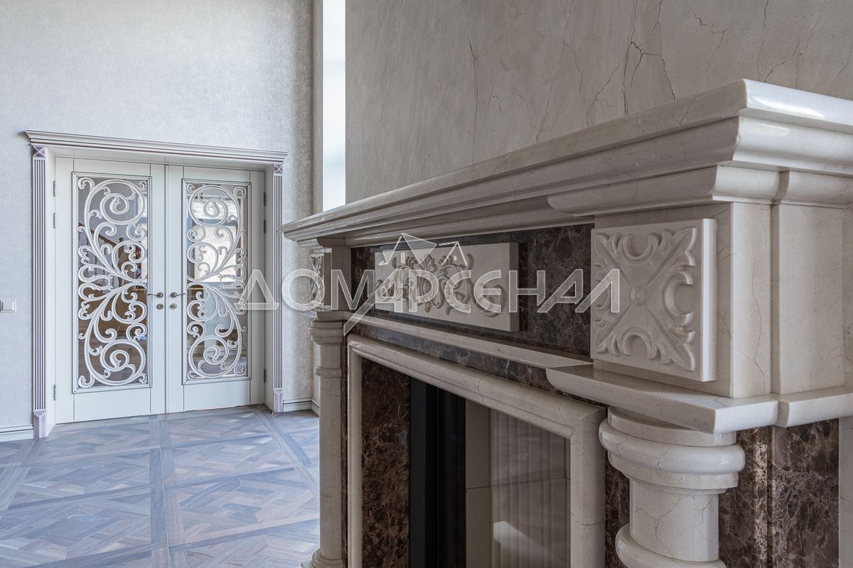 • Использованы премиальные материалы: стены - венецианская штукатурка и итальянские обои; двери и лестница выполнены на заказ из итальянского массива дуба; пол - керамогранит с системой "теплый пол" и инженерная доска; подоконники и камин - мрамор