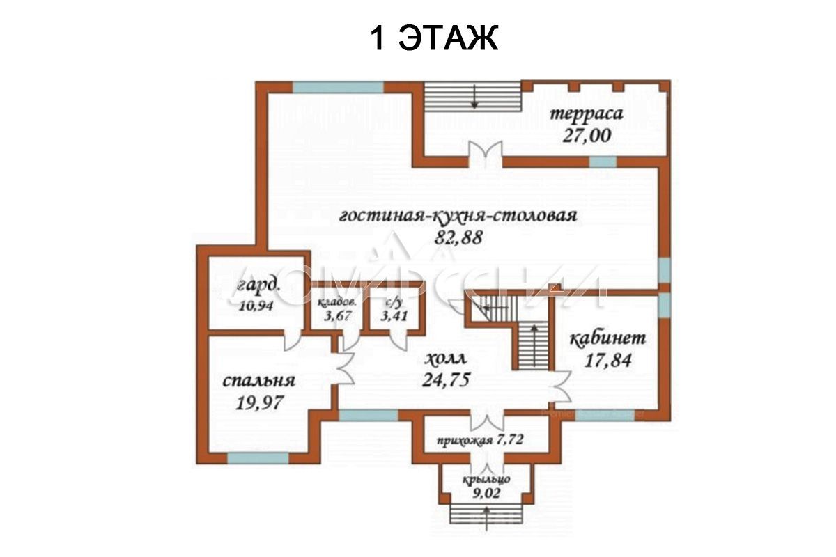 1 этаж: прихожая, холл, гостиная-кухня-столовая 83 кв.м, спальня 20 кв.м, кабинет 18 кв.м, с/у, терраса 27 кв.м