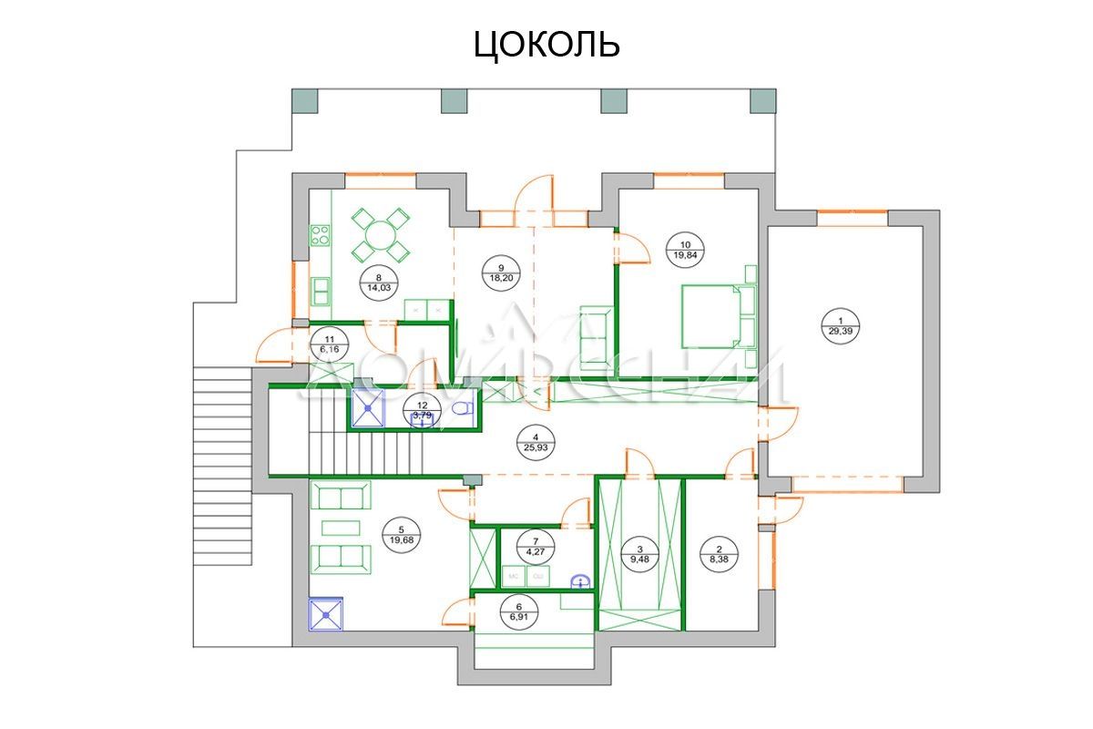 Цокольный этаж: SPA-зона: сауна, комната отдыха; прихожая, кухня-столовая, гостиная с выходом на террасу, спальня, с/у, холл, постирочная, котельная, помещение для хранения, гараж