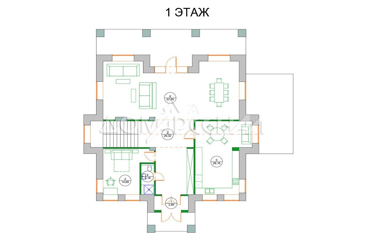 1 этаж: прихожая, холл, кухня, гостиная-столовая в едином пространстве с выходом на балкон, кабинет, с/у