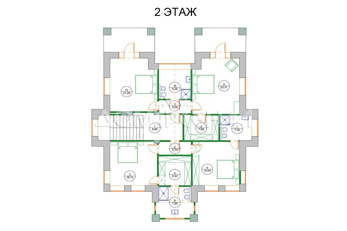 2 этаж: холл, мастер-спальня с гардеробной и с/у, спальня с с/у, спальня с гардеробной и выходом на балкон, спальня с выходом на балкон, с/у