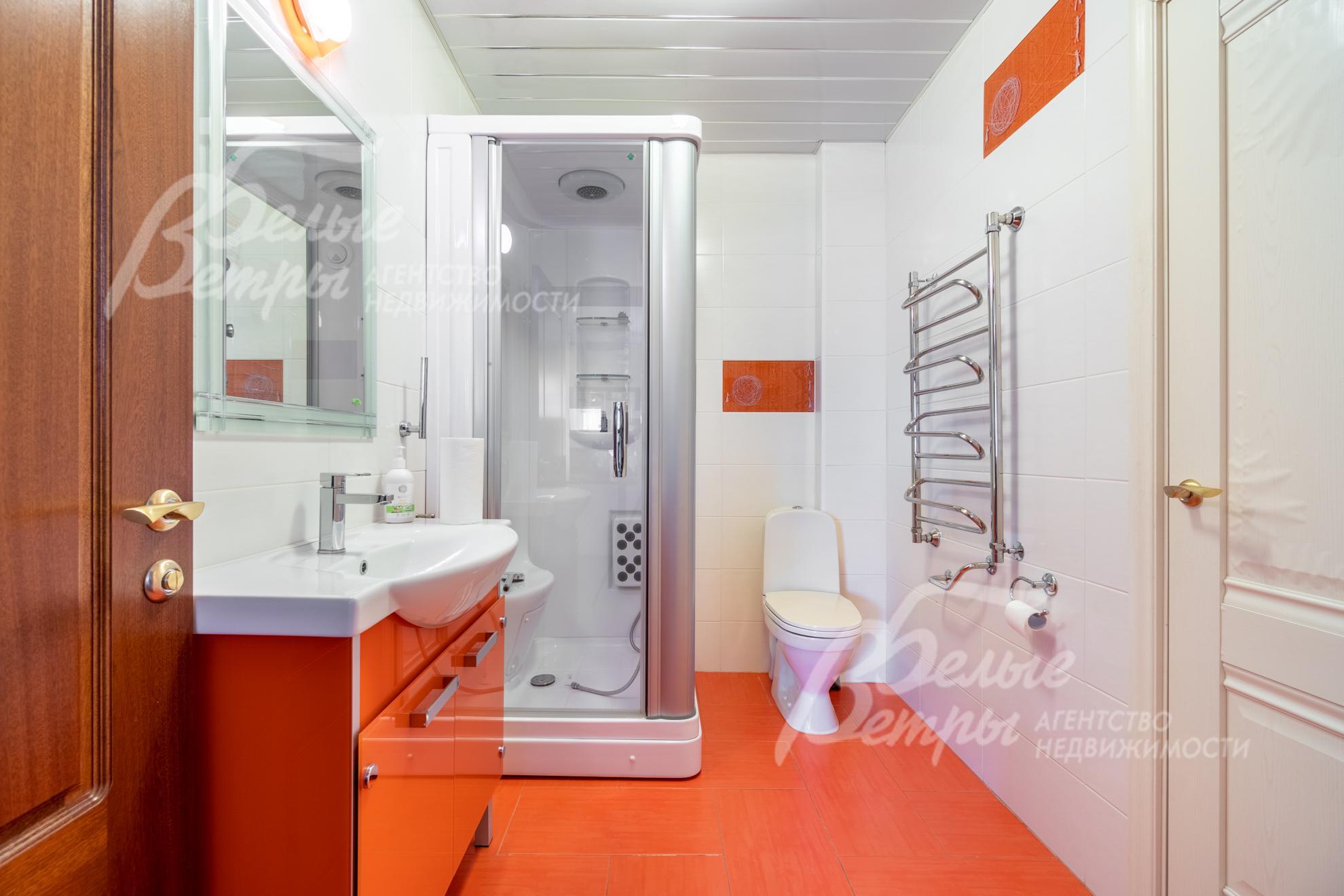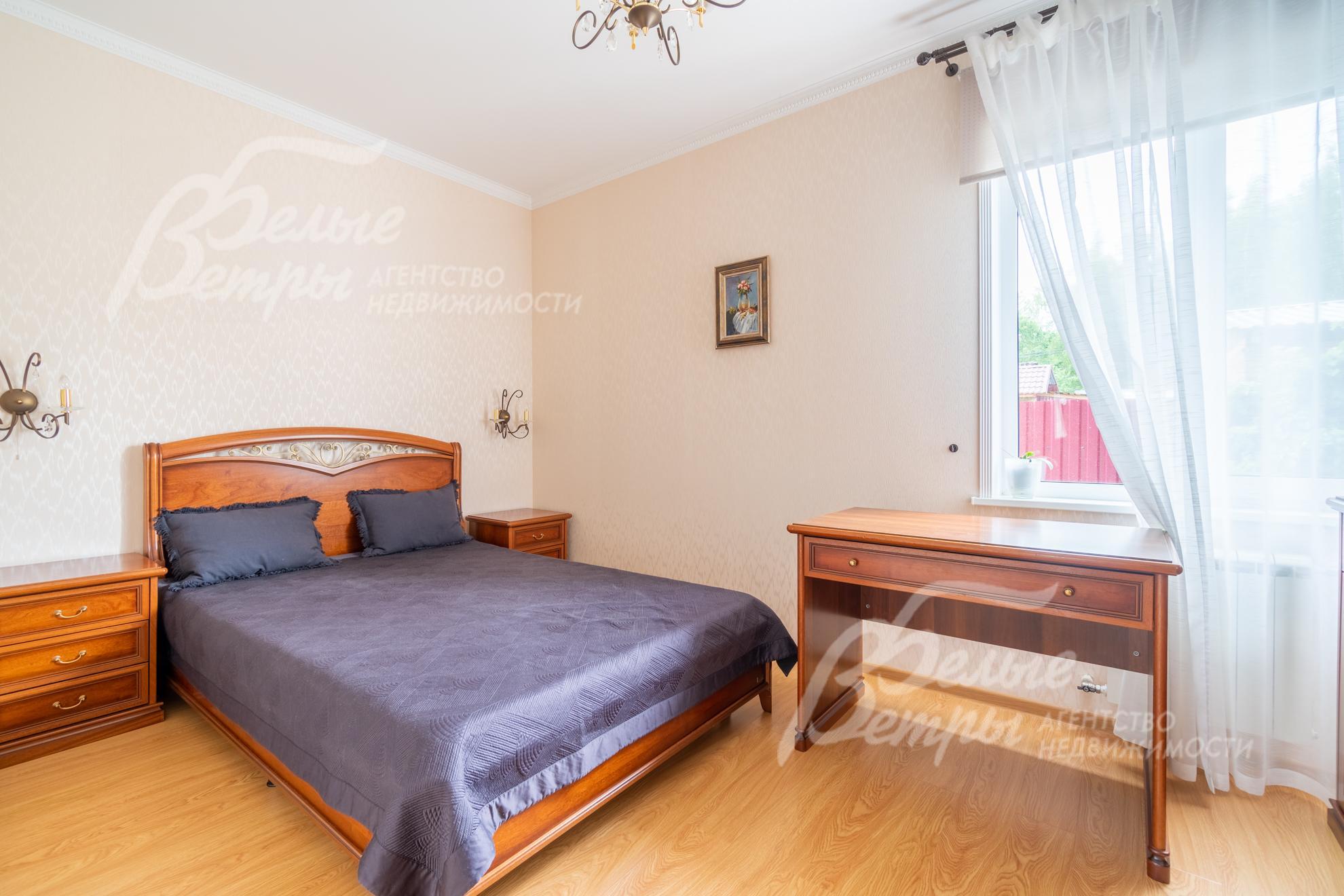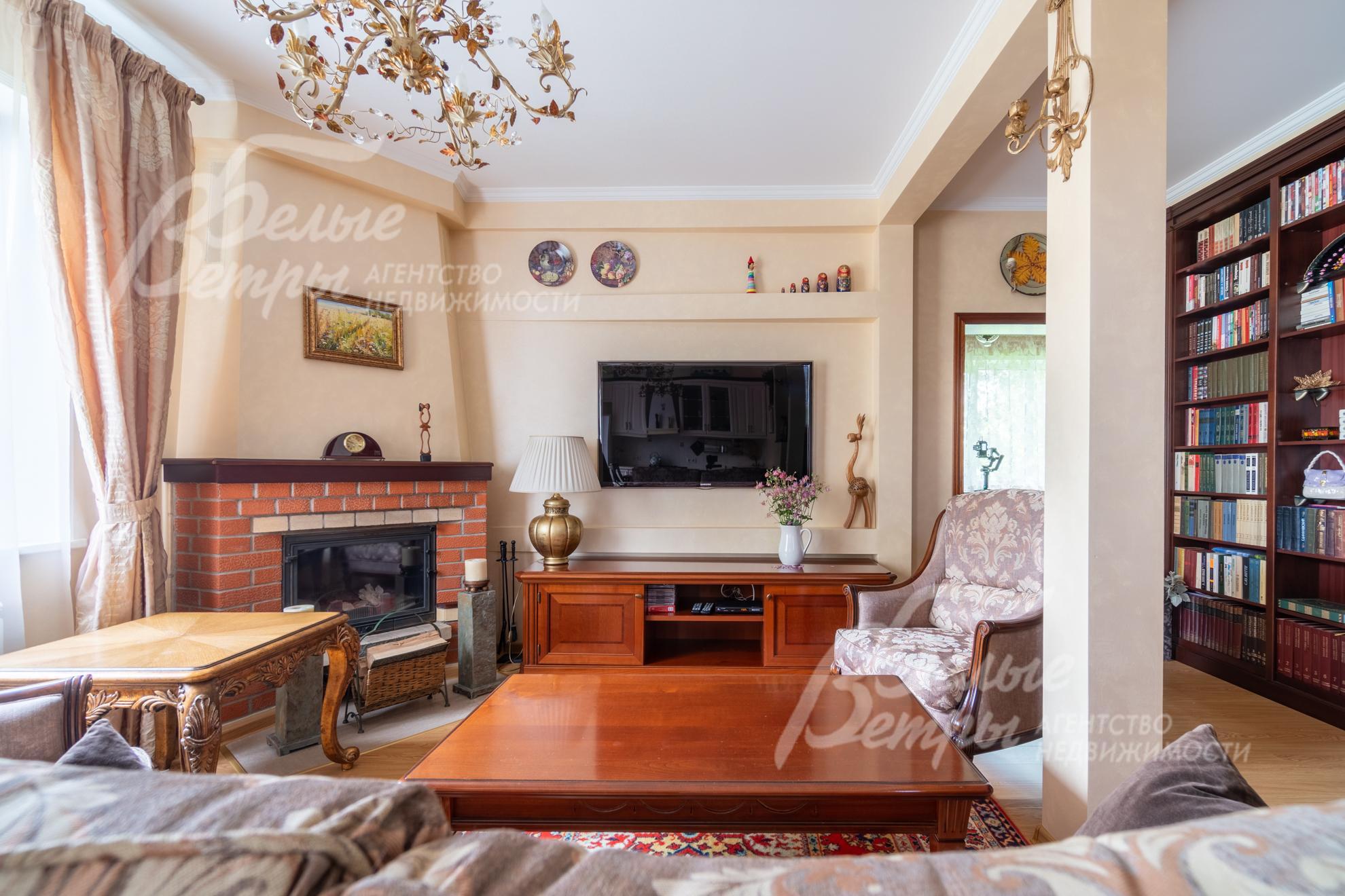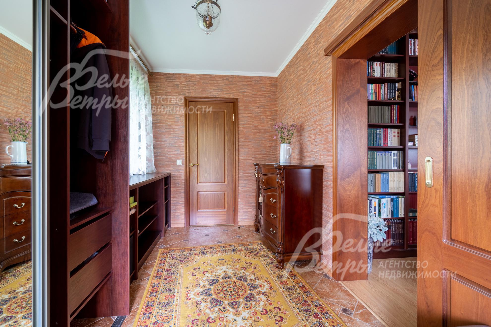 Внутренняя отделка: выполнена отделка под ключ в классическом стиле из качественных материалов. Стены обшиты гипсокартонными листами на подсистеме, отделка – декоративной штукатуркой и обоями. На полу – ламинат, в санузлах – плитка. Потолки из гипсокартона. Установлены межкомнатные двери из массива дуба, радиаторы, белые подоконники ПВХ. На второй этаж ведёт деревянная лестница из массива дуба.