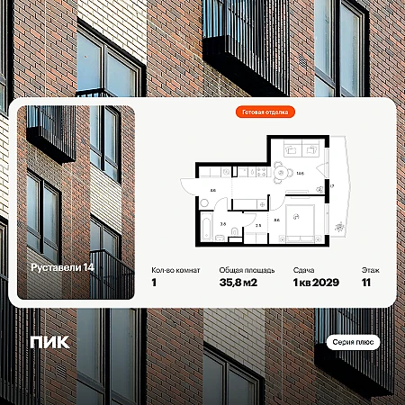 Жилая площадь 36.99 м2, кухня 4.07 м2. Площадь комнат: 14.70/11.33/10.96 м2, квартира без отделки, лоджий - 1, окна выходят во двор.