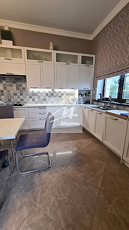 Фундамент дома и перекрытия - монолитная плита из мостового бетона. Материал стен дома - газосиликатные блоки 40 см + утепление 10 см. Дом хорошо держит тепло зимой, летом прохладу. На первом этаже расположена прихожая с большой стеклянной входной группой, просторная светлая гостиная с красивой лестницей из натурального дуба, кухня с неотапливаемой кладовой (для круглогодичного хранения) и выходом на террасу, кабинет и большой санузел.