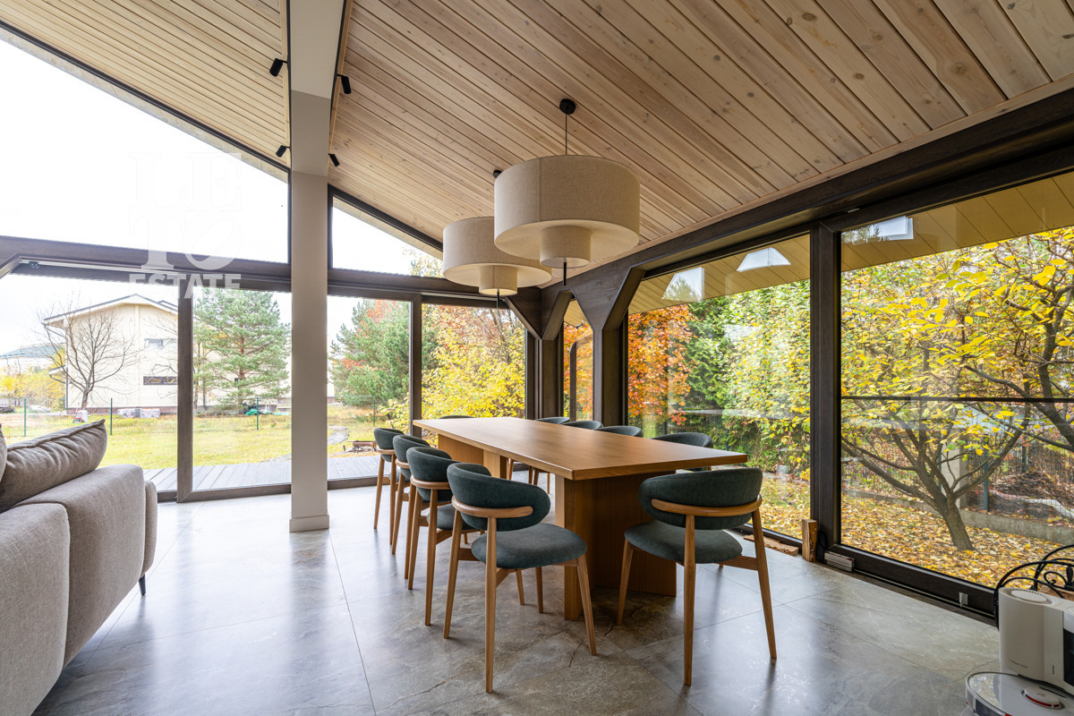 Одноэтажная вилла под ключ. Высокие потолки и 60% остекления дома даю ощущение безбарьерного нахождения на лоне природы. Выход, во двор,на участок имеется из каждой комнаты. В гостиной установлен Испанский дровяной камин. В зоне кухни установлен остров шириной 4 метра.