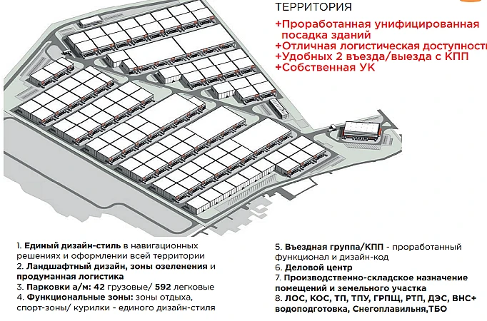 Современный складской комплекс с развитой внутренней инфраструктурой для комфортной работы. Широкие проезды между зданиями, удобные для маневрирования большегрузного транспорта. На территории предусмотрены места общественного питания, спортивный зал и площадки, помещения для проведения конференций и отдыха. Круглосуточные душевые общего пользования. Парковки для личного и грузового транспорта с зонами отдыха для водителей - 1.8 га. Собственная управляющая компания.
