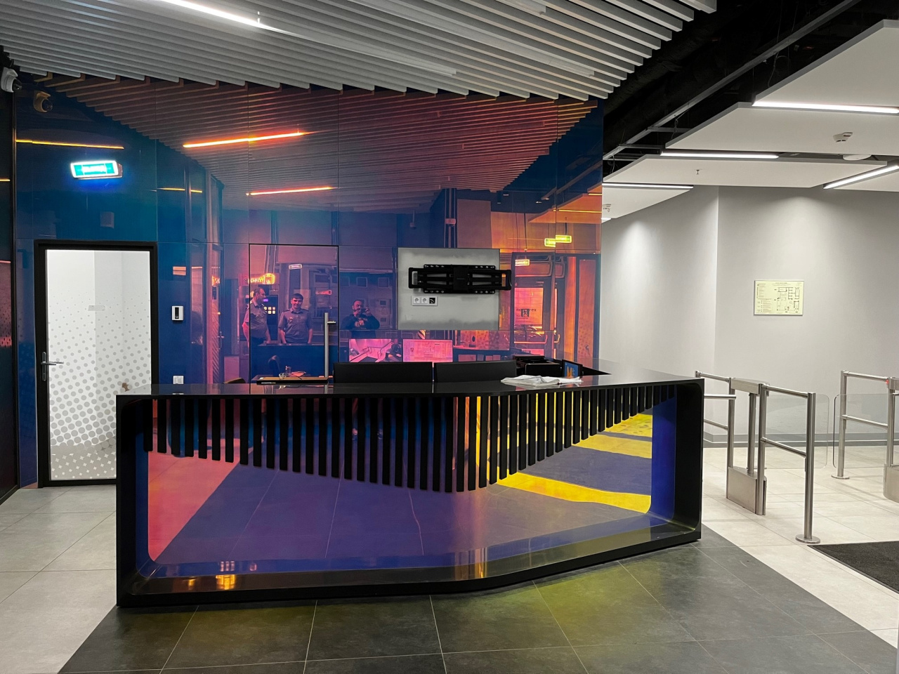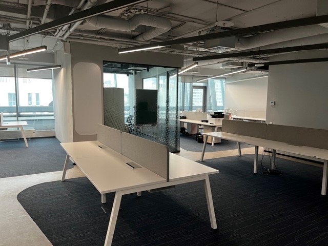 Смешанная планировка помещения: большое открытое пространство open-spase, а также кабинеты поменьше, комната приёма пищи, переговорные, гардероб, открытая терраса. Панорамное остекление здания обеспечивает отличное естественное освещение и прекрасные виды.