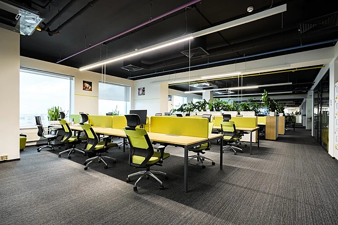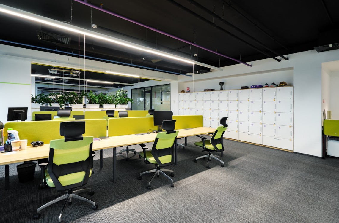 Есть ресепшн, переговорные комнаты разного формата, ячейки для хранения личных вещей сотрудников, собственная кухня и сан.узлы.