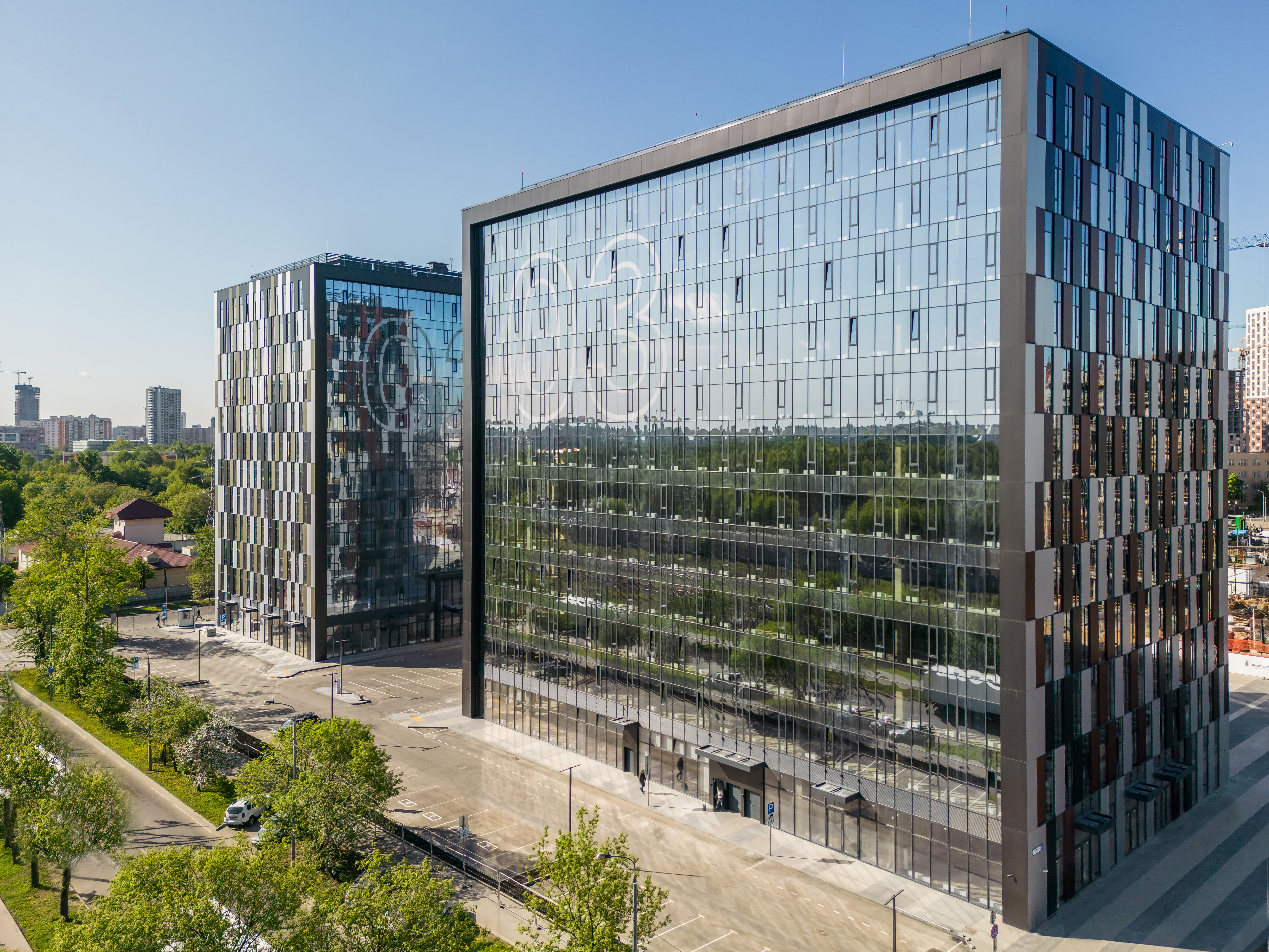 - Панорамное остекление от пола до потолка наполняет пространства светом и открывает виды, создавая ощущение свободы и простора для вашей команды.