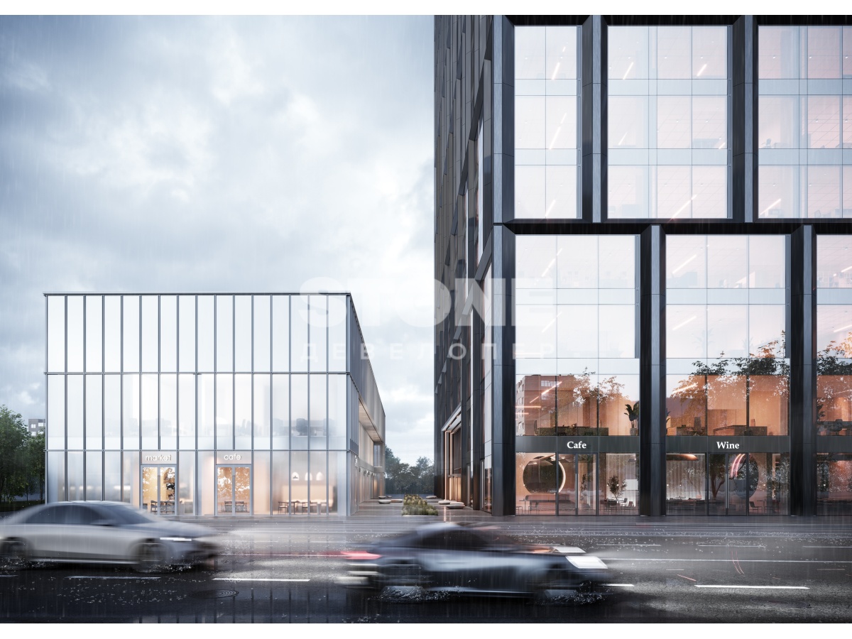 Архитектура от бюро IND. Проектом предусмотрена 23-этажная офисная башня с динамичным фасадом, а также торговая галерея с панорамным остеклением. Общая площадь бизнес-центра составит 49 тыс. кв. м.