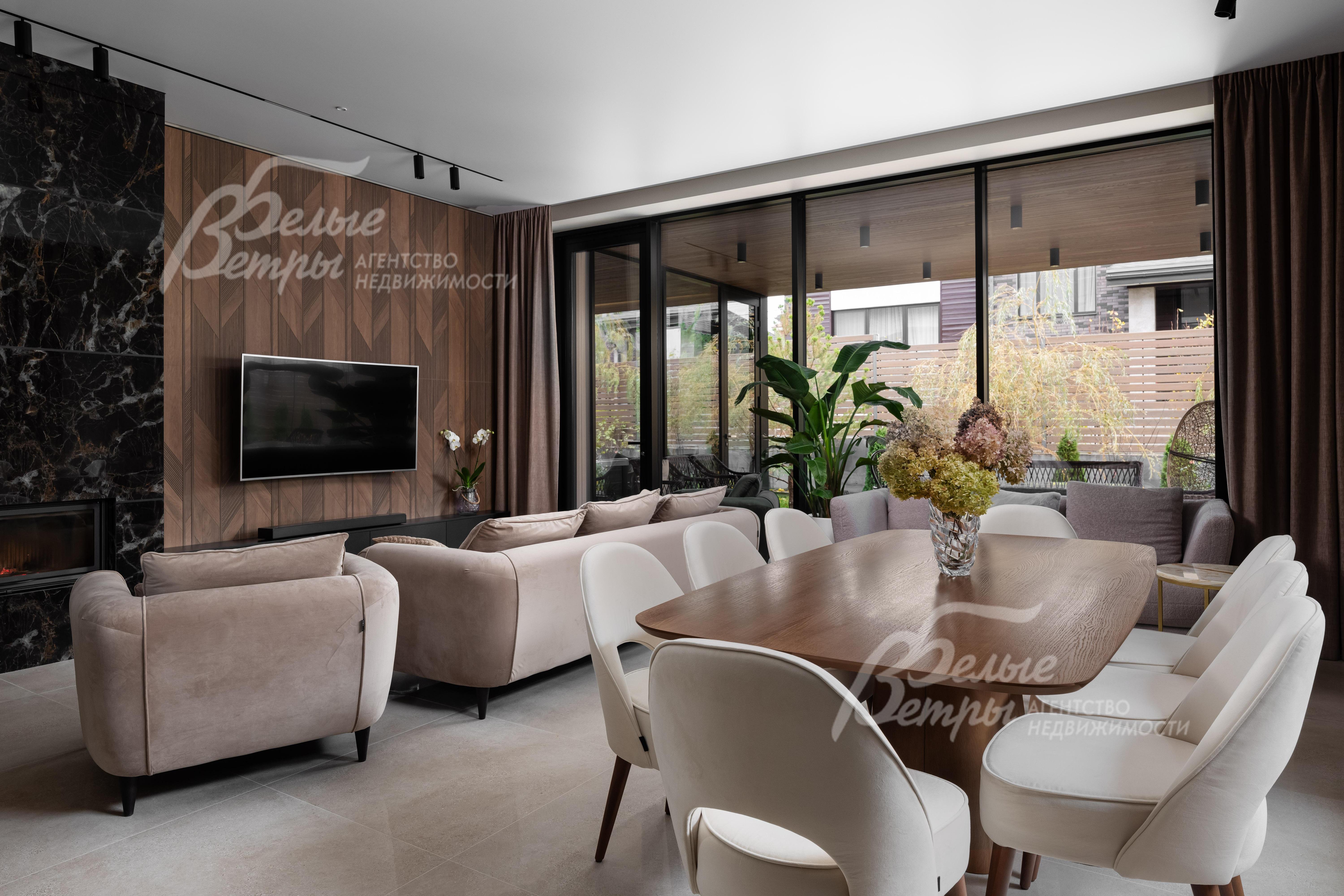 Мебель, оборудование: дом полностью меблирован. На кухне: гарнитур из МДФ с покрытием матовой эмалью, столешница из кварцевого агломерата, фурнитура Hettich (Германия), встроенная техника: СВЧ-плита, духовая печь, индукционная плита со встроенной центральной вытяжкой (Bosch), холодильник, винный шкаф, измельчитель пищевых отходов, фильтр для питьевой воды. В комнатах: велюровые диваны (Грей Кардинал), мебель бренда MdeHouse. В мастер-спальне – зеркало с многоуровневым и диверсионным освещением. В санузлах – импортная сантехника. В постирочной: стиральные и сушильные машины, сушильный шкаф (Miele). В СПА-зоне: джакузи на 5 мест (США) с постоянным подогревом и фильтрацией, хамам. На террасе – мягкая мебель, освещенный столик, качели-кокон.