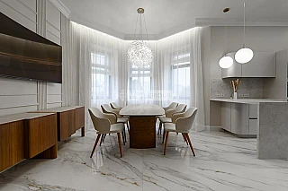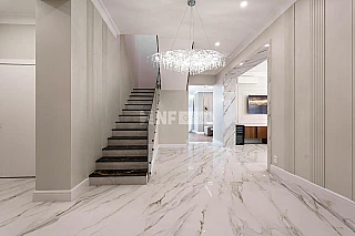 Внутренняя отделка: выполнена стильная отделка по дизайнерскому проекту. На стенах – краска (Англия), на первом этаже – обои, расписанные красками, обои (Lincrusta, Англия), сланец. На полу - крупноформатный керамогранит, кварцвинил (Германия), пробковая доска (Швеция). Потолки со встроенной подсветкой и трековыми светильниками на алюминиевом профиле (Maytoni, Германия). Тёмным керамогранитом под мрамор облицованы камин, стены в санузлах и в холле. На второй этаж ведёт «парящая» лестница (на металлическом каркасе) с подсветкой в основании, ступенями из дуба, стеклянным ограждением. Установлены радиаторы, розетки и выключатели (Schneider Electric, Франция), межкомнатные двери скрытого монтажа из шпона дуба высотой 2,4 м (Академия Дверей), входная дверь и дверь на террасу с алюминиевым профилем высотой 3 м (Schüco, Германия), подоконники из керамогранита. В хамаме и джакузи – переливающийся свет и приглушенная музыка, прозрачная стена с видом на террасу.