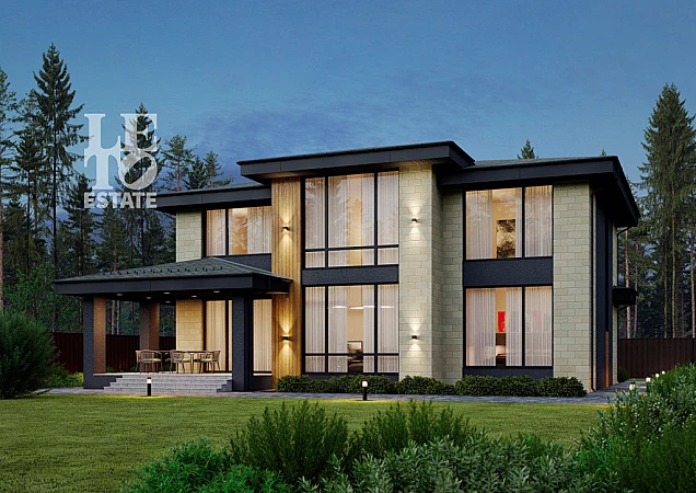 В архитектурном проекте данного дома продумано все до мельчайшей детали. Применение древесины, светлого и графитового цвета камня в экстерьере напоминает о природном анклаве, в котором расположен дом. Находясь в данном доме, ощущается особенная умиротворенность. Дом подходит для круглогодичного проживания всей семьи.
