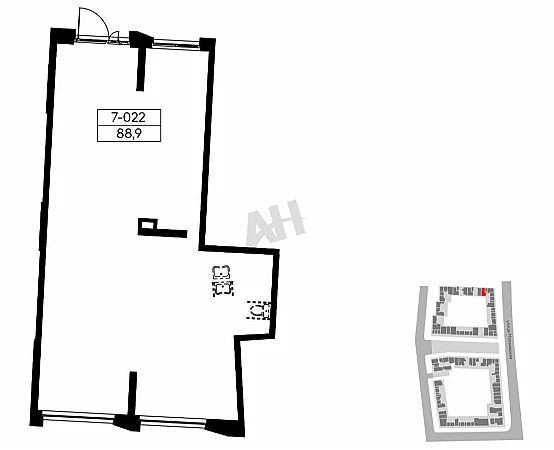 Помещение обладает следующими характеристиками: площадь 88,9 м², высота потолков 4,21 м, разрешенная мощность 17,78 кВт. Вентиляционная система представлена каналами 200×150 мм и Ø100 мм. Объект имеет один вход, расположен на одном этаже. Витринное остекление отсутствует, отделка не выполнена.
