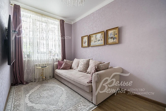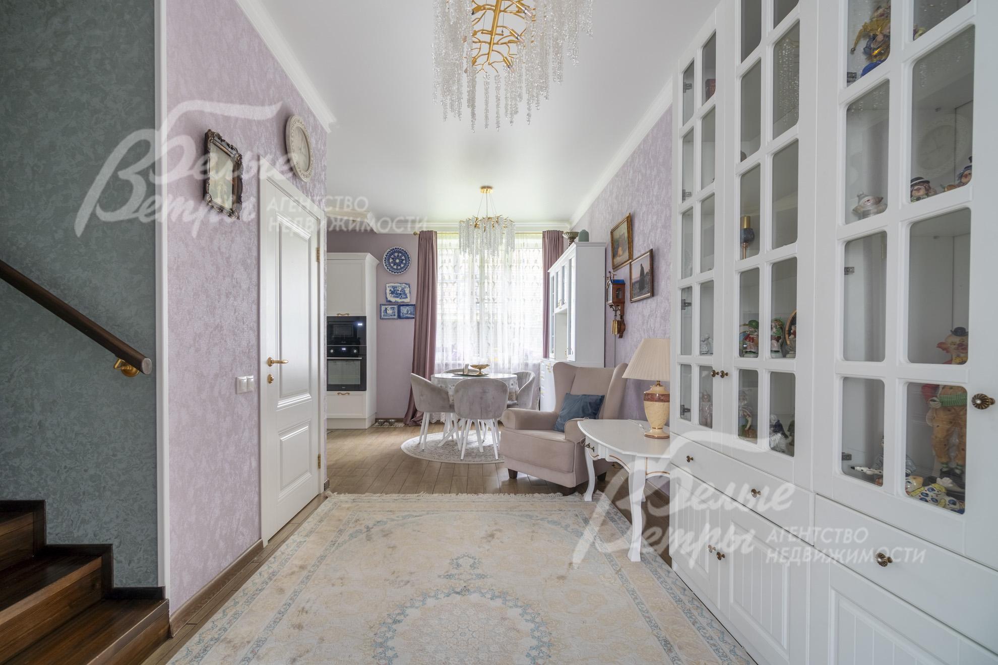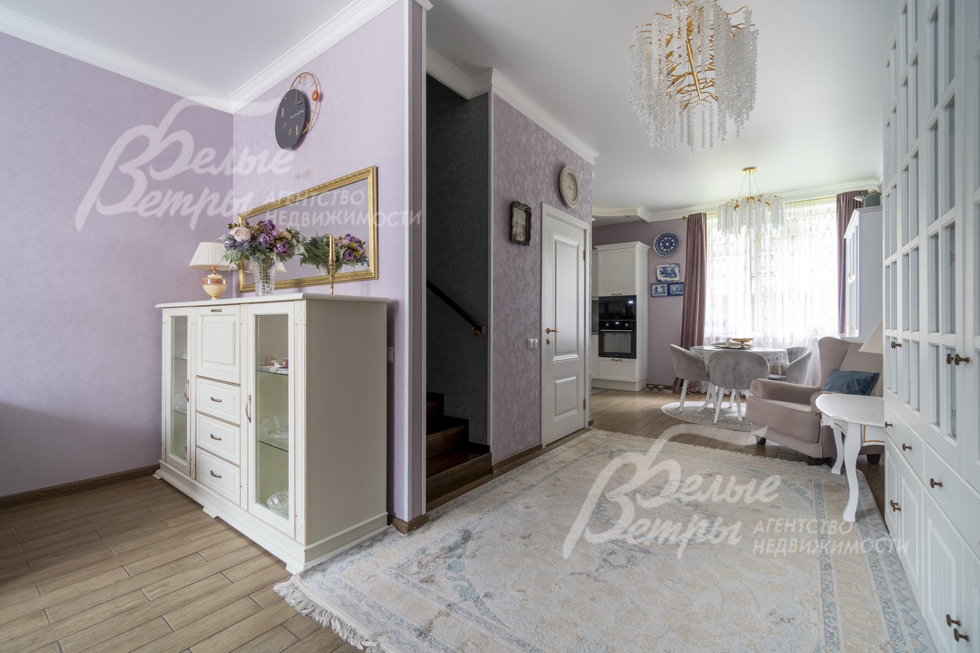 Внутренняя отделка: классический стиль в тёплых постельных тонах: на стенах обои, в санузлах - плитка Kerama Marazzi. Пол на 1ом этаже отделан керамогранитом. Потолки натяжные. Лестница на металлокаркасе, шириной 80-84 см, обшита лиственницей, поручень из окрашенной лиственницы, забежные ступени. Двери - крашенный МДФ (Ульяновская фабрика) с магнитными замками. Подоконники - ПВХ глянцевые. В санузлах установлены смесители Grohe. На 3-ем уровне выведено электричество, установлены розетки, пол выложен керамогранитом..