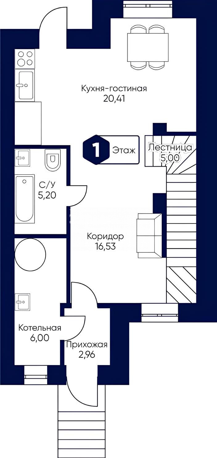 1-ый этаж: общаая 36.7 кв.м: тамбур 3.9 кв.м, холл 9 кв.м, гостиная 10 кв.м, кухня-столовая 12.6 кв.м, санузел 1.2 кв.м.
