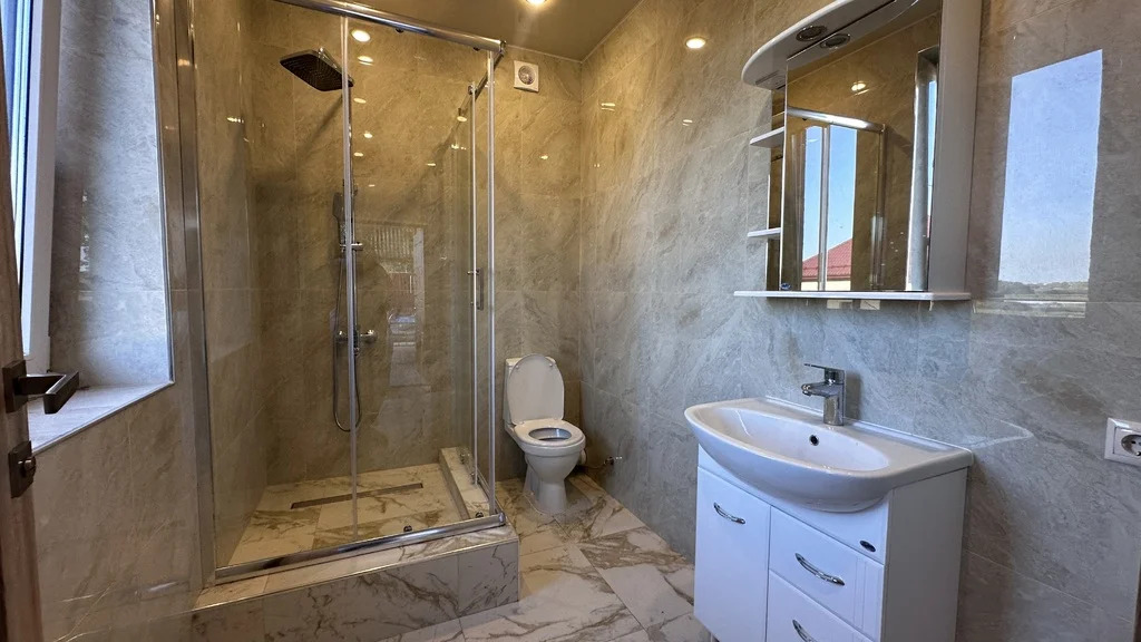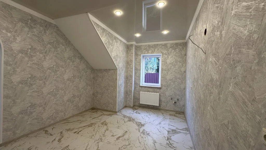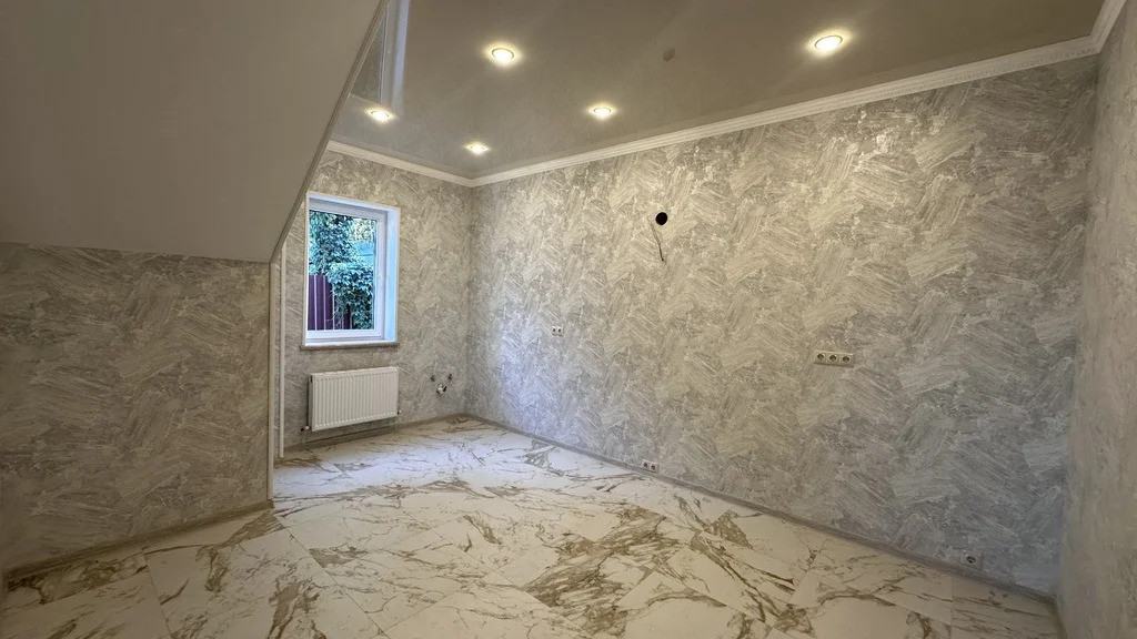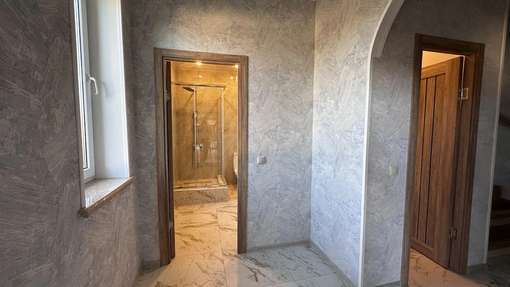 Обои спокойных пастельных тонов, которые подойдут под любой дизайн, а ванная комната отделана плиткой под дорогой мрамор. На втором этаже есть ванная, это редкость для загородных домов.