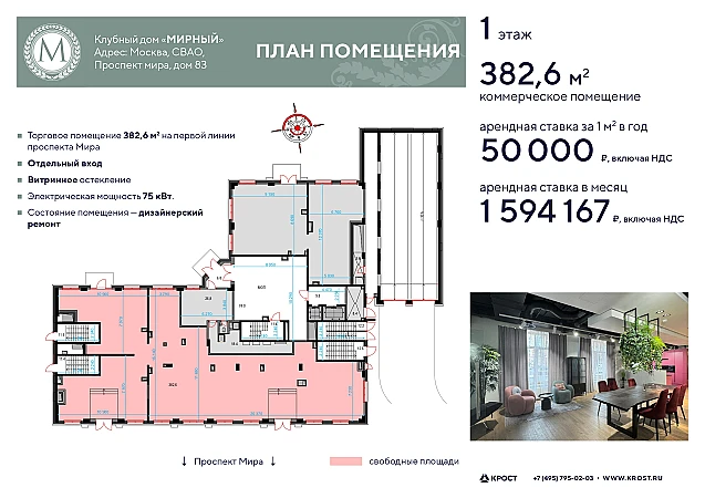 Аренда помещения свободного назначения с отделкой площадью 382,6 кв. м, на 1 этаже Клубного дома "Мирный" (Проспект Мира, д.83).