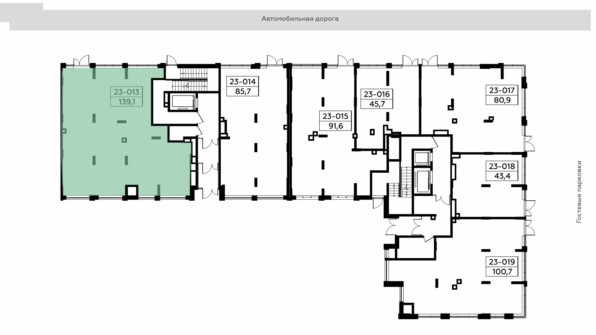 Помещения для бизнеса представлены в разных форматах – от 25 м2 до 2 тыс. м2. Высота потолков от 4 м до 6,35 м. Предусмотрена свободная планировка и возможность объединения с соседними лотами. Характеристики помещений позволяют реализовать любой бизнес-проект.