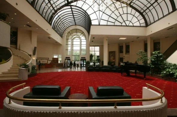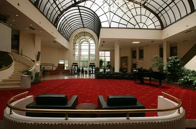 Монолитный жилой корпус с торговой галереей -пассаж, и сконцентрированных вокруг нее ресторанами, спортивно-оздоровительным центром, детским садом, прачечной и прочими коммерческими помещениями. Вход в здание оформлен в виде постмодернистского стеклянного портала, через который попадаешь в просторное пространство вестибюля и далее в интерьер торговой галереи